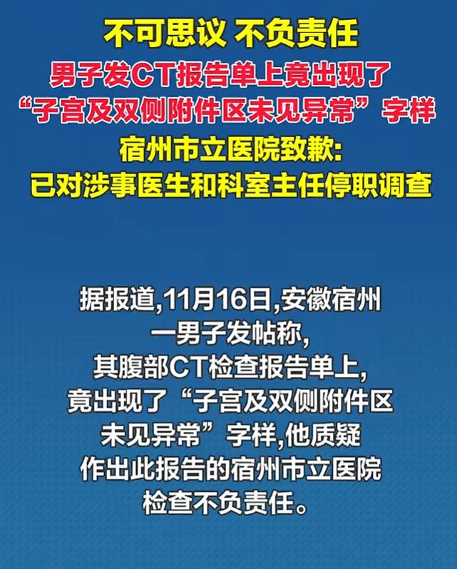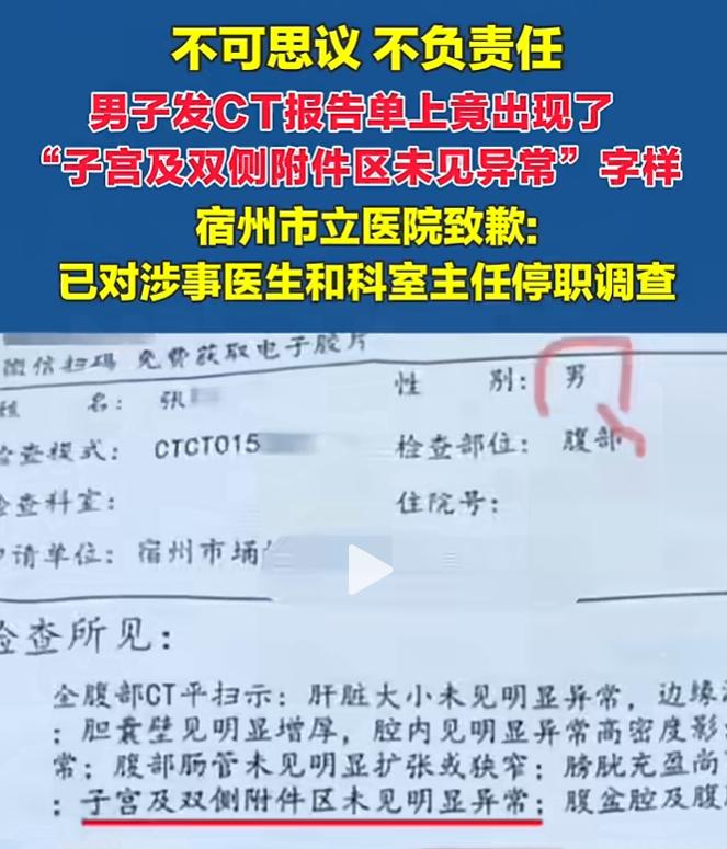 近日安徽宿州,男子去宿州市立医院做检查,CT检查单上竟然发现自己多了个器官,检查单上写着子宫及双侧附件区未见异常。男子直接怒了,在媒体上发怒质问:我一大老爷们,给我搞一子宫,不愧为宿州的三甲医院。这样的检查报告,太不负责了。 谁能想到,一个活了几十年的大老爷们,居然被医院检查出自己有子宫,男子把情况发到网上后,也让不少网友愤怒。 有的网友说:因为诊断报告很多医生都是在前一位患者的报告上改的 所以会出现这样的现象 我是亲眼所见。 还有的网友说:还有更离谱的 我同事是女生,单位体检说她前列腺肥大。 还有网友说:我去做妇科检查身体,医生把我写男性18岁,我问医生这个检查结果有效果吗?她们说没有关系的检查的是妇科就行了,把我气炸了 在帖子发出后,宿州市立医院也发现了问题,成立专门工作组开展调查,目前已对涉事医生和所在的科室主任停职调查,对存在的制度落实不到位,医疗质量关不不规范等问题表示诚恳道歉。 医院的处罚结果来的很快,但是网友们显然对结果不买账,现在医院的各项检查越来越繁琐,想看什么病都要先做好几项检查之后医生才给开药,患者们也是因为对医院和医生的信任,才愿意花钱做检查保平安。 可是现在检查报告都能胡乱写,那医生开的药岂不是很容易开错,又或者报告有错误也不担心医生开药,那做这么多检查还有什么作用? 这件事给所有的医院和医生都提了醒,如果是真有必要的检查,那就认认真真检查认认真真写报告,确保医生能按照报告正确行医;如果是无所谓的检查,就不要为了赚钱而坑害老百姓了,老百姓现在不容易,少坑我们点钱吧! 素材来源:国+社区
