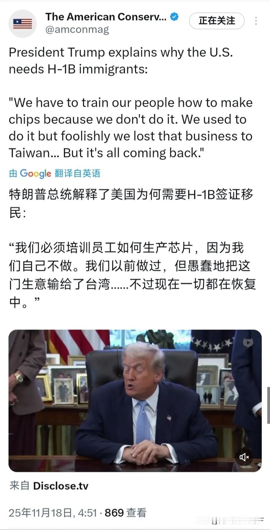 特朗普:美国把芯片市场输给台湾,现在需要把输掉的东西再夺回来 11月17日特朗普面对记者的询问向记者解释为什么美国需要H-1B移民签证,他以台湾为例子表示,美国人已经把芯片市场输给了台湾,现在美国需要 H-1B 移民来制造电脑芯片,并且培训美国工人 评几句:美国在之前以为有美元霸权,再加上军事实力就可以打遍世界无敌手,于是乎将各种产业都分包给各国,他们只负责印白花花的钞票,结果嘚瑟大了,把自己花的债台高筑。现在又开始重整制造业。 问题是他想这么干,养尊处优的美国人可不想这么干。再加上芯片产业布局是市场长期选择、技术积累与全球分工协作的结果。不是靠想就行的。