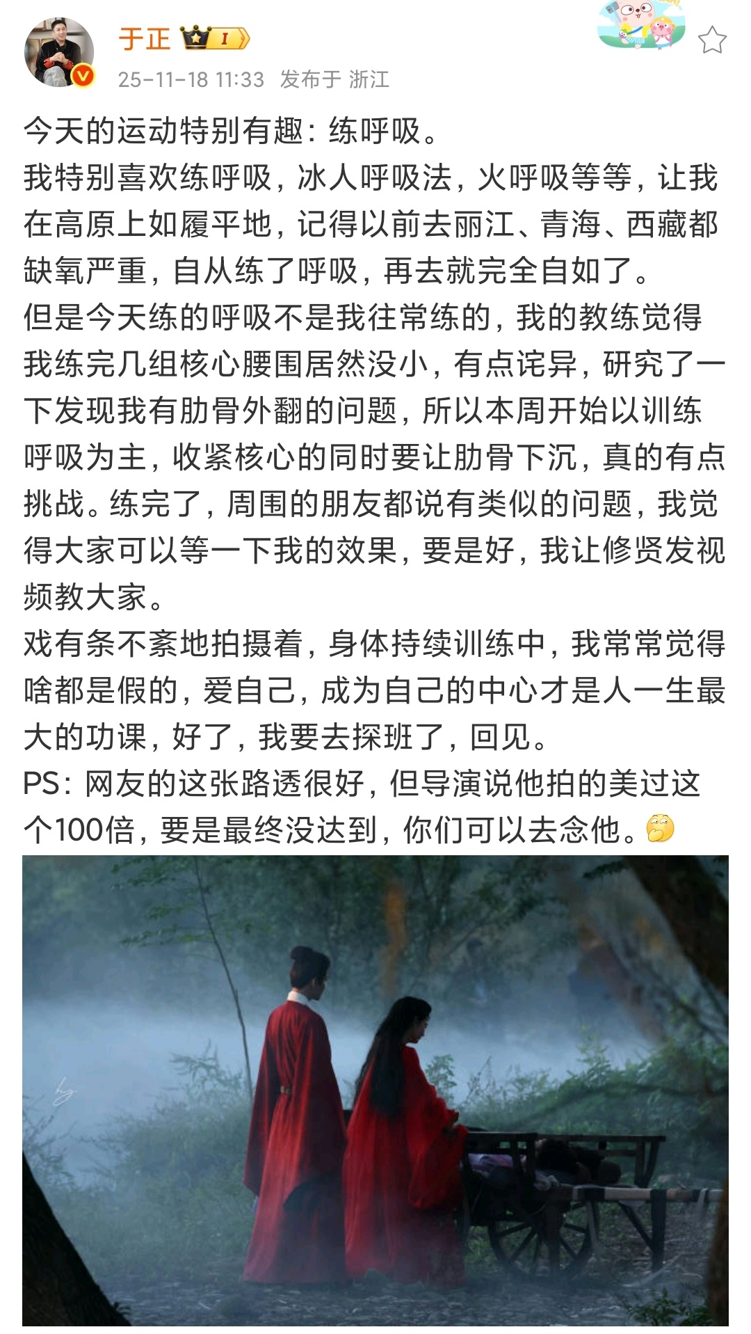 于正:觉得啥都是假的,爱自己,成为自己的中心才是人一生最大的功课!!!于正晒网友拍的周柯宇赵晴路透,说导演拍的美过这个100倍!!依旧自信