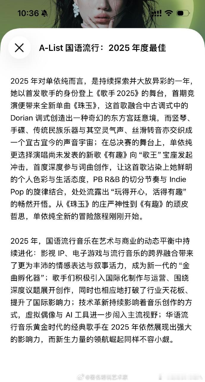 单依纯《珠玉》登顶 Apple Music 2025 榜单,弱混声控制堪称教科书,成为 00 后歌手实力标杆。