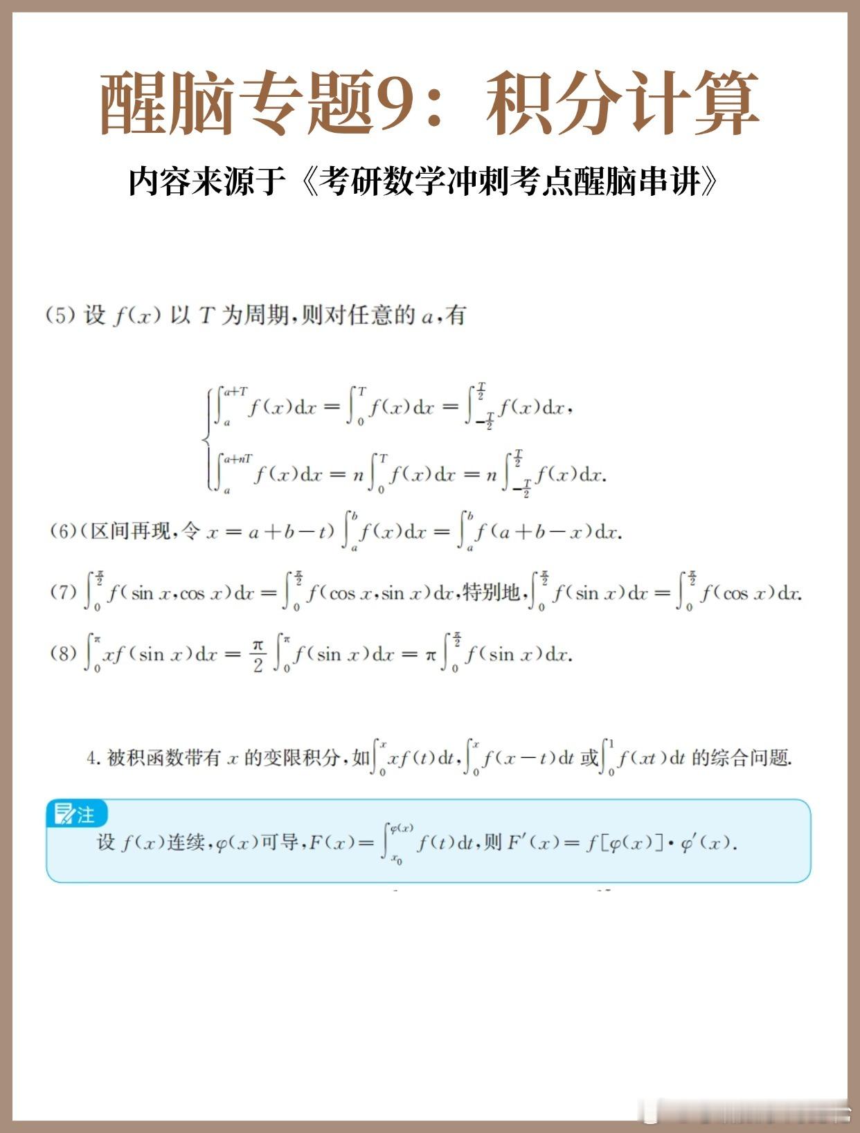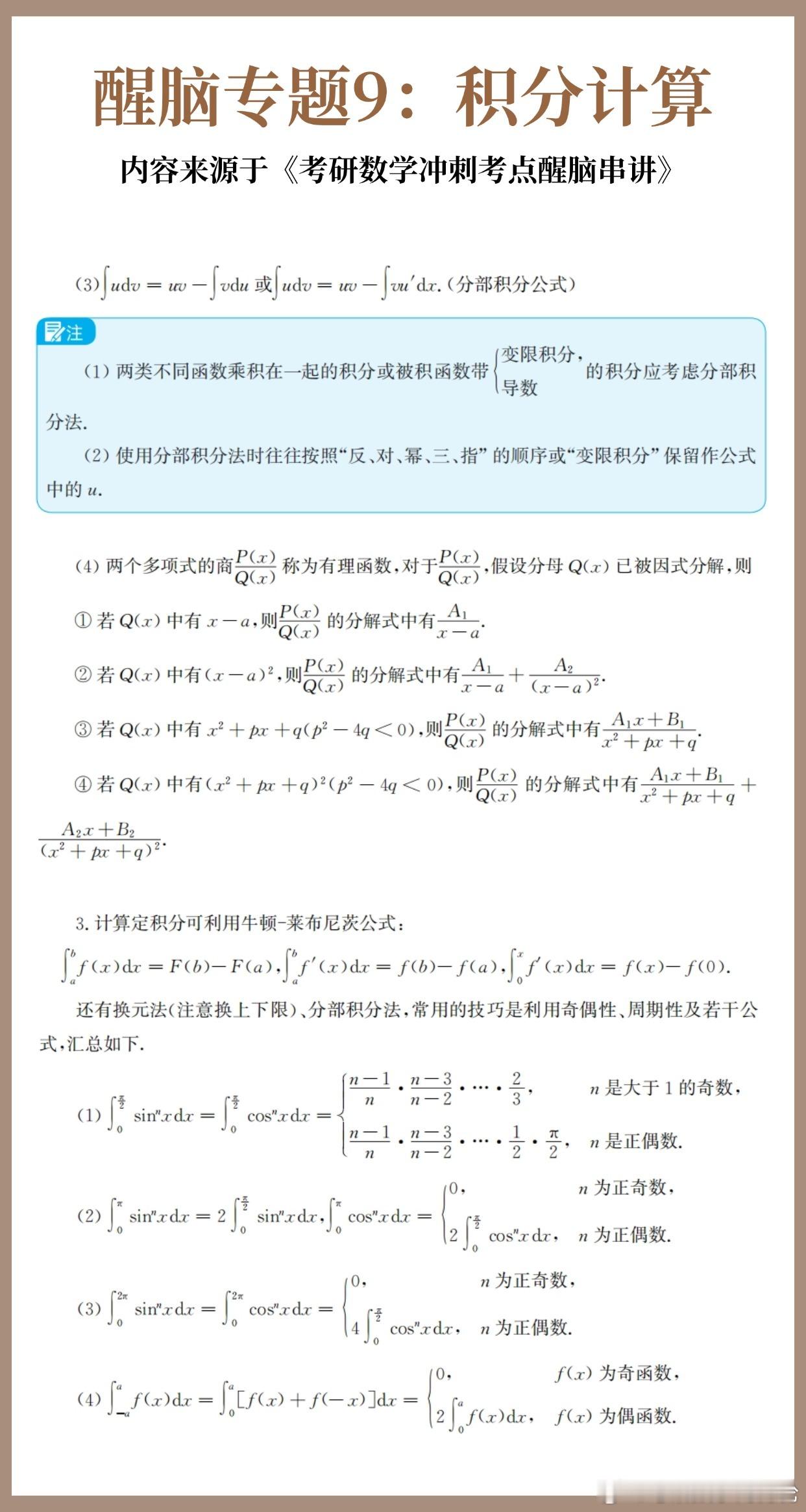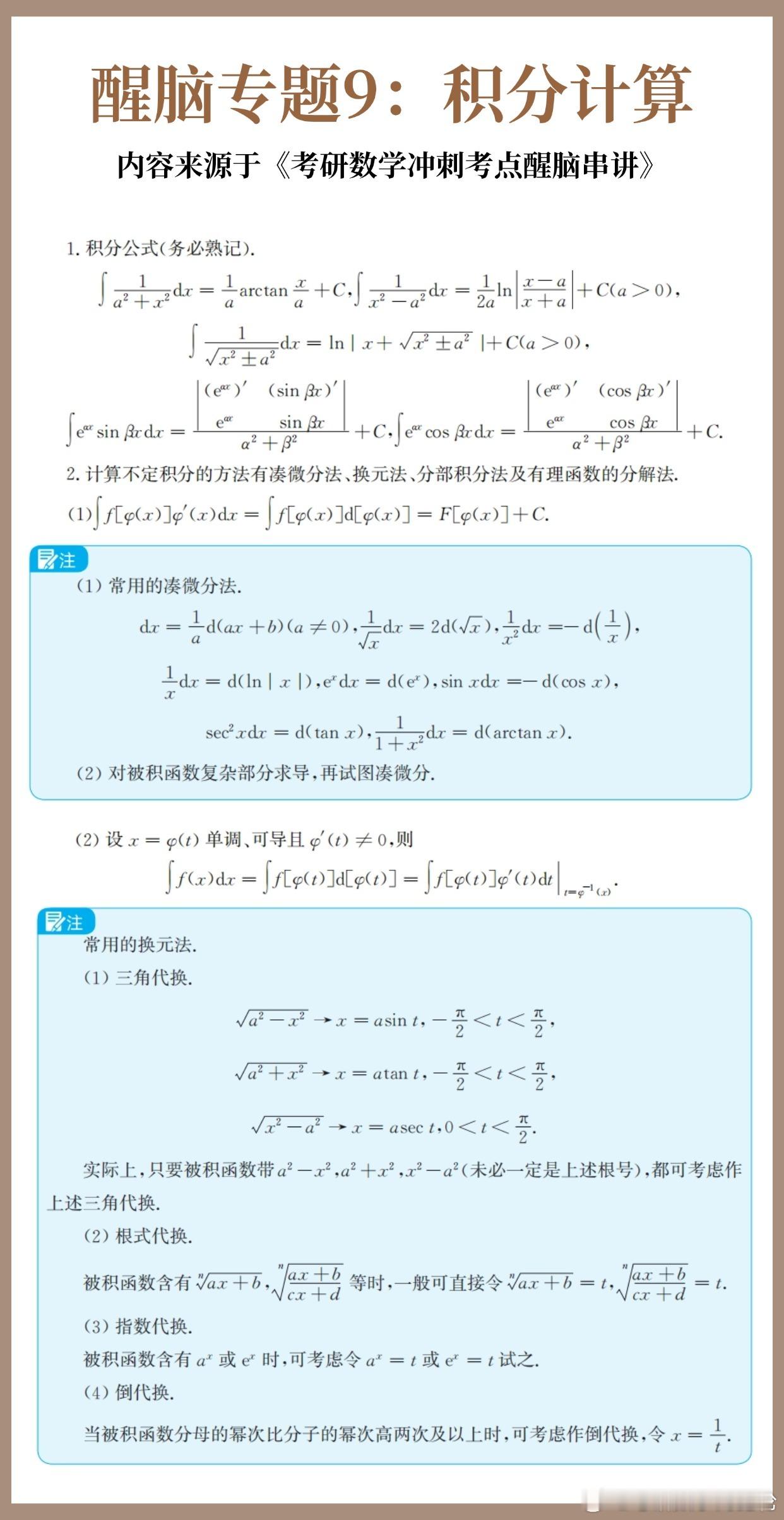 考研数学30天急救计划!【醒脑专题9】:积分计算30天30个核心专题,把数学重要的公式和考法总结回顾一遍!每天背一背,写一写,不负过往,终将上岸!