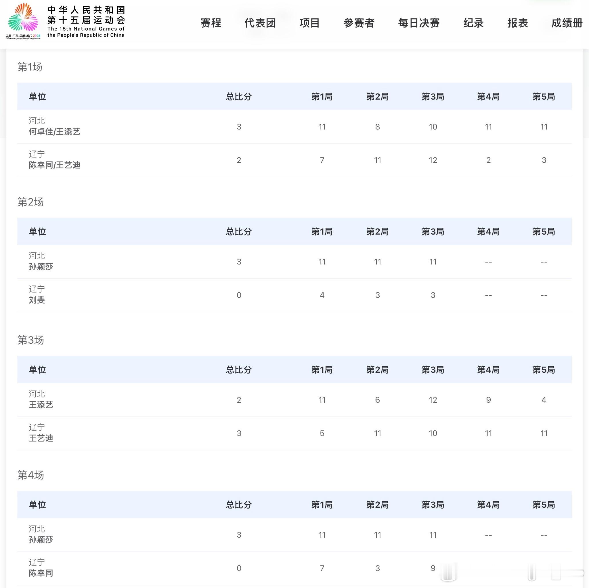 女子团体1/4决赛河北3-1辽宁何卓佳/王添艺3比2陈幸同/王艺迪孙颖莎3比0刘斐王添艺2比3王艺迪孙颖莎3比0陈幸同河北队晋级全运会女团四强