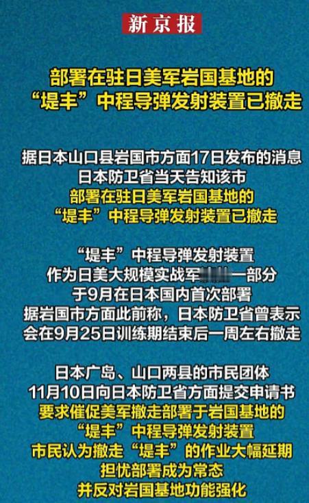 特朗普果然比拜登识时务多了,就在大家都以为日本会找老美求援的时候,老美竟然已经把堤丰中导悄悄地从日本撤走了。 这明摆着就是不想让日本人闯下的祸殃及到他们身上,至于保护那就更是想都别想了,要知道特朗普找日本索要的3500亿保护费,日本还没有交呢?特朗普这个唯利是图的商人总统又怎么可能会出手相帮呢? 近期日本在地区事务上动作频频,不少人都猜测它会第一时间向美国求援,可没想到美国的反应比谁都快,悄没声地就把部署在日本的“堤丰”中程导弹系统撤了回去。 这波操作一下就戳破了美日同盟里“保护”的假象,也让人看清特朗普比拜登确实识时务得多——不做亏本买卖,从来都是他的核心准则。 “堤丰”系统刚部署到日本的时候,日方还高调宣传这是“应对周边威胁”的关键力量,甚至有政客放话“有美国撑腰,完全不用怕”。 可真等局势有了变化,最先跑路的就是美国。这种反差一点不意外,特朗普政府的对外逻辑从来都很直接:要么给钱换保护,要么自己承担风险。 去年他就公开向日本索要3500亿日元的“驻日美军特别保护费”,理由是“美国为日本挡了太多风险,这笔钱天经地义”,可日本一直拖着没给齐,这会儿想让美国伸手,简直是异想天开。 对比拜登时期的模糊策略,特朗普的“商人思维”反而更实在,拜登政府总爱用“同盟精神”画大饼,结果往往是美国占尽好处却不担责。 特朗普则把利益摆上台面,给多少钱办多少事,没给钱就绝不硬扛风险,这次撤走“堤丰”,就是最直接的表态:日本闯的祸自己兜着,别想拉美国下水。 要知道“堤丰”系统部署成本不低,美国真要是想保日本,绝不会轻易撤走这种“战略资产”,如今的举动分明是在划清界限。 日本其实早该看清这点,这些年它跟着美国跑,又是买武器又是搞联合军演,花了不少钱却没换来真正的安全保障。 特朗普的“唯利是图”至少让规则变透明了,而不是像过去那样被“同盟”的幌子蒙骗。 美国撤走导弹的举动也给其他盟友提了醒,所谓的“保护”从来都是建立在利益之上,与其寄望别人,不如踏实做好自己的事,在国际博弈里,没有免费的保护伞,这点特朗普比谁都看得明白。 以上都是个人观点,对此您有什么不同的看法,可以在评论区留言讨论!!!