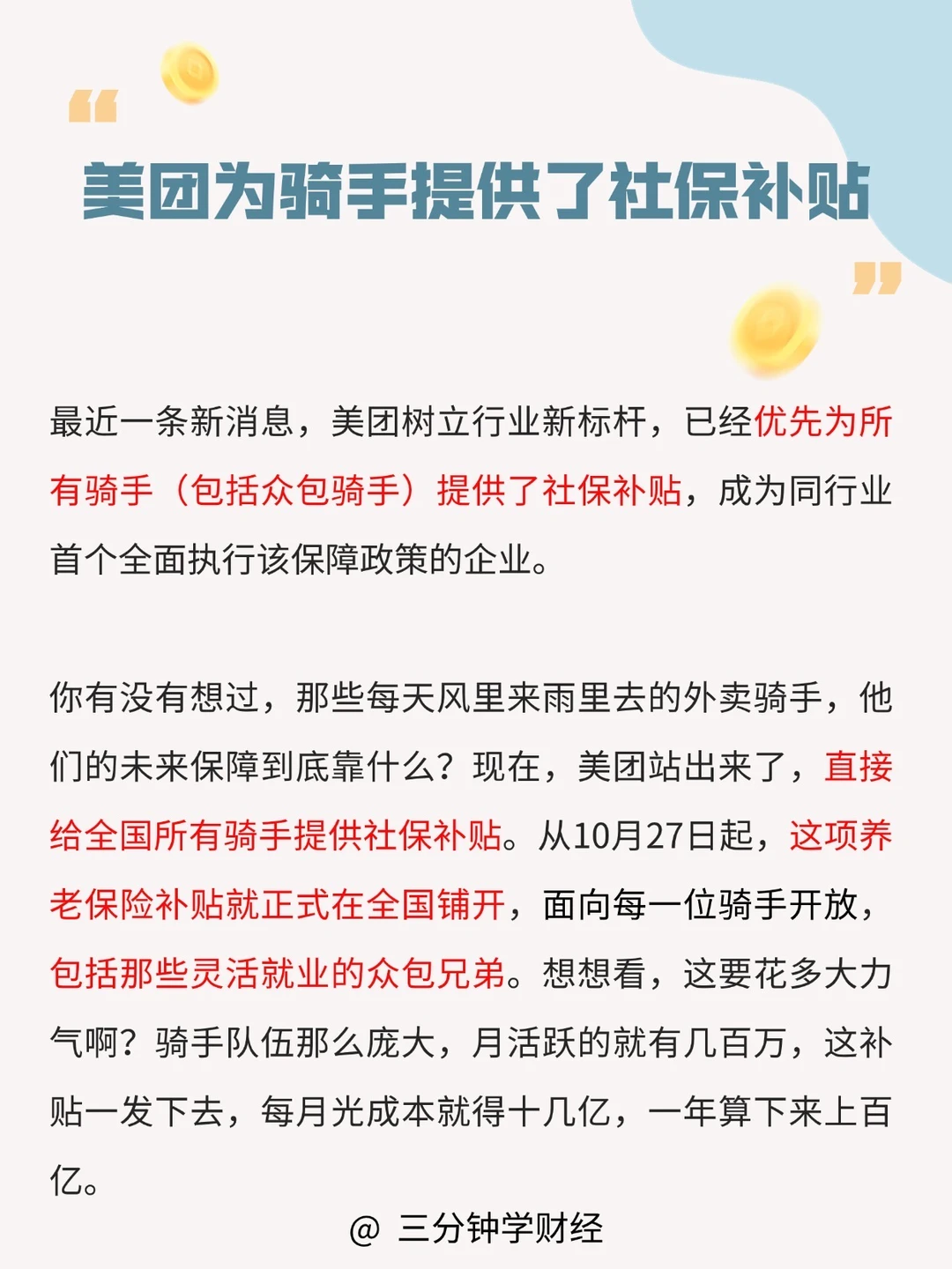 美团这次干了一件大事!他们率先给所有骑手,包括众包的骑手,提供社保补贴,成为行业第一个全面落实的企业。