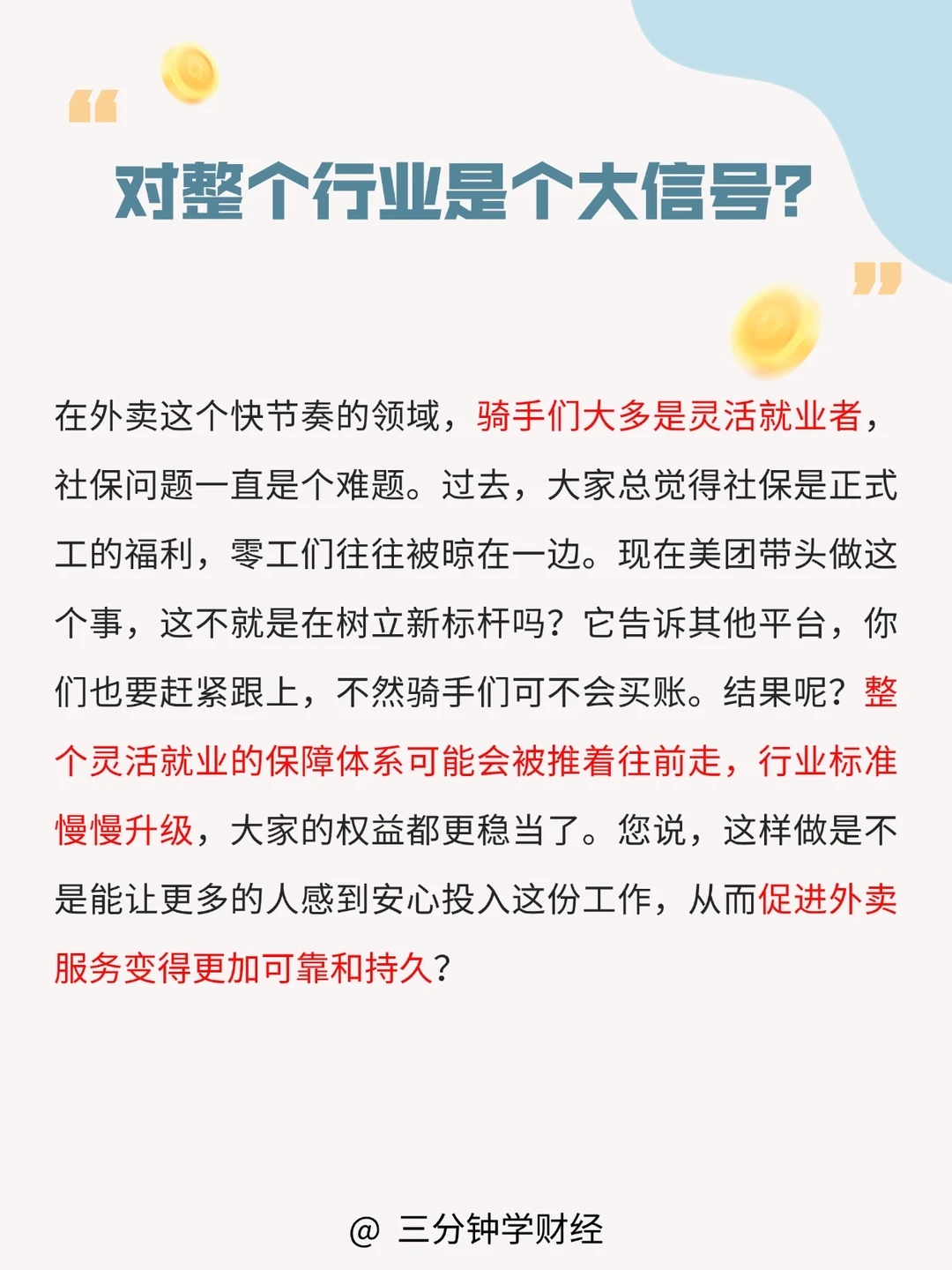 这不光是骑手解决了养老医疗的后顾之忧,更是给外卖行业树了个标杆,推动大家更规范地发展,让灵活就业的人更有保障。想想那些风里来雨里去的骑手,他们可是城市运转的“神经末梢”,疫情时还顶着风险送餐保民生,现在给他们社保补贴,就是对他们劳动的肯定和人文关怀。