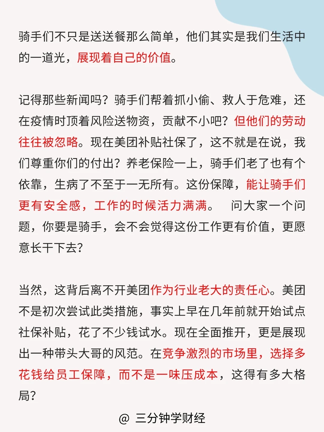 作为龙头老大,美团主动“大出血”保障权益,这责任感满分,不仅提升了自己形象,还给整个平台经济注入了正能量。这创举值得点个大赞,期待更多企业跟上,一起推动社会更公平更进步!