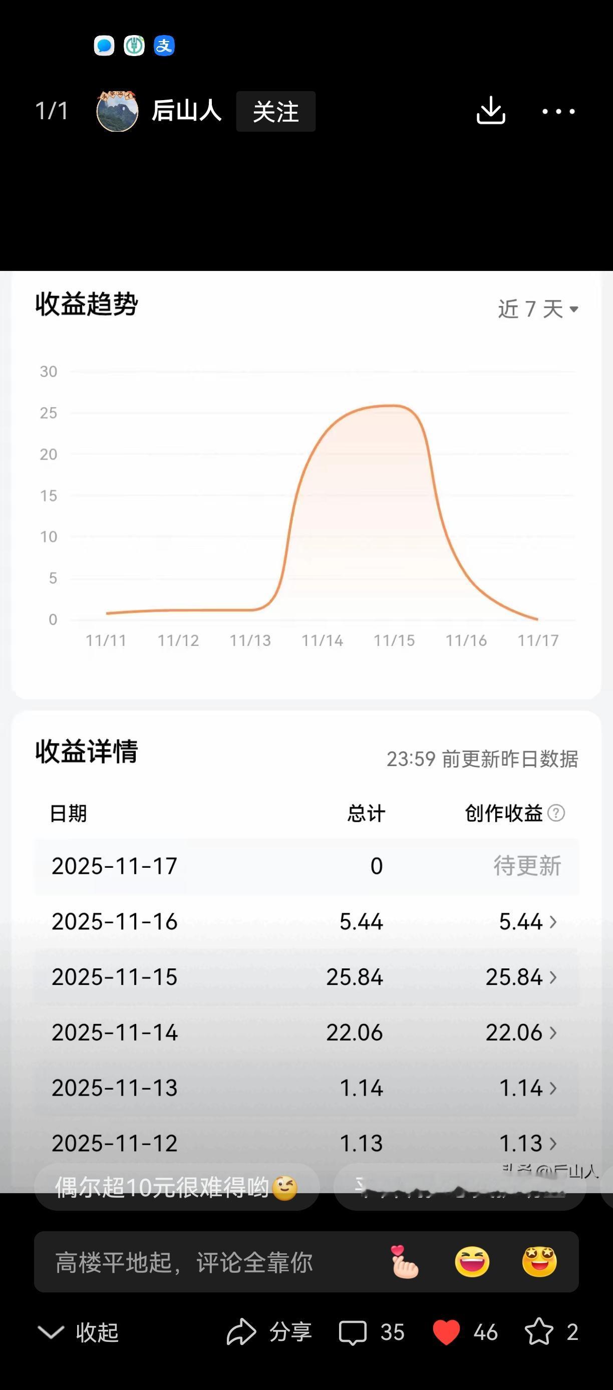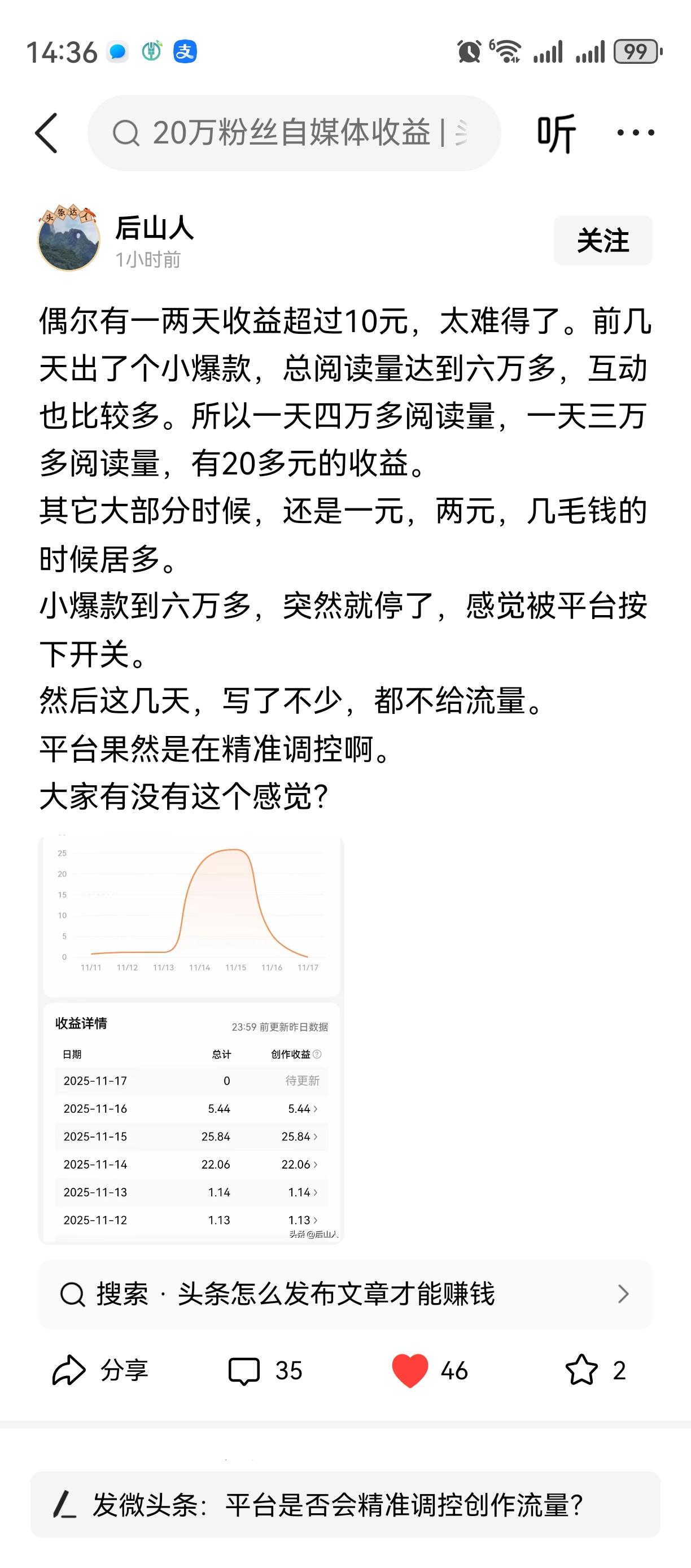 10块多的收益,偶尔来一次确实够让人稀罕的!前几天小爆款六万多阅读量,一天二十多块,那感觉肯定特爽。可突然就停了,写啥都不给流量,确实像被平台精准调控了似的,换谁都得琢磨琢磨。 其实好多人都有这感受,流量时好时坏太正常了。想让微头条收益稳点,有个小招:小爆款之后别慌,接着围绕类似话题写点延伸内容,比如从爆款里的评论找灵感,保持和粉丝的互动感;就算流量差,也别断更,每天写点生活化的小片段,让账号保持活跃,平台慢慢就会重新给流量了。