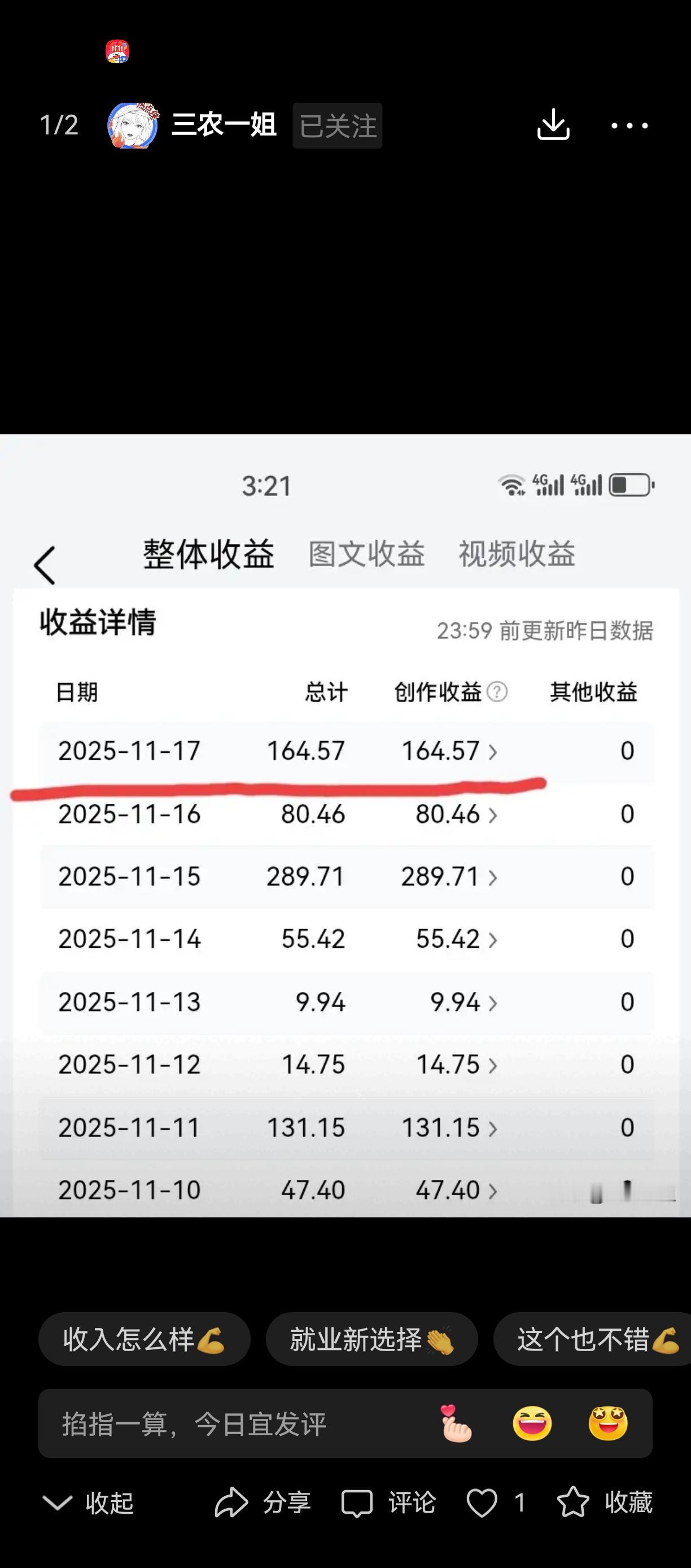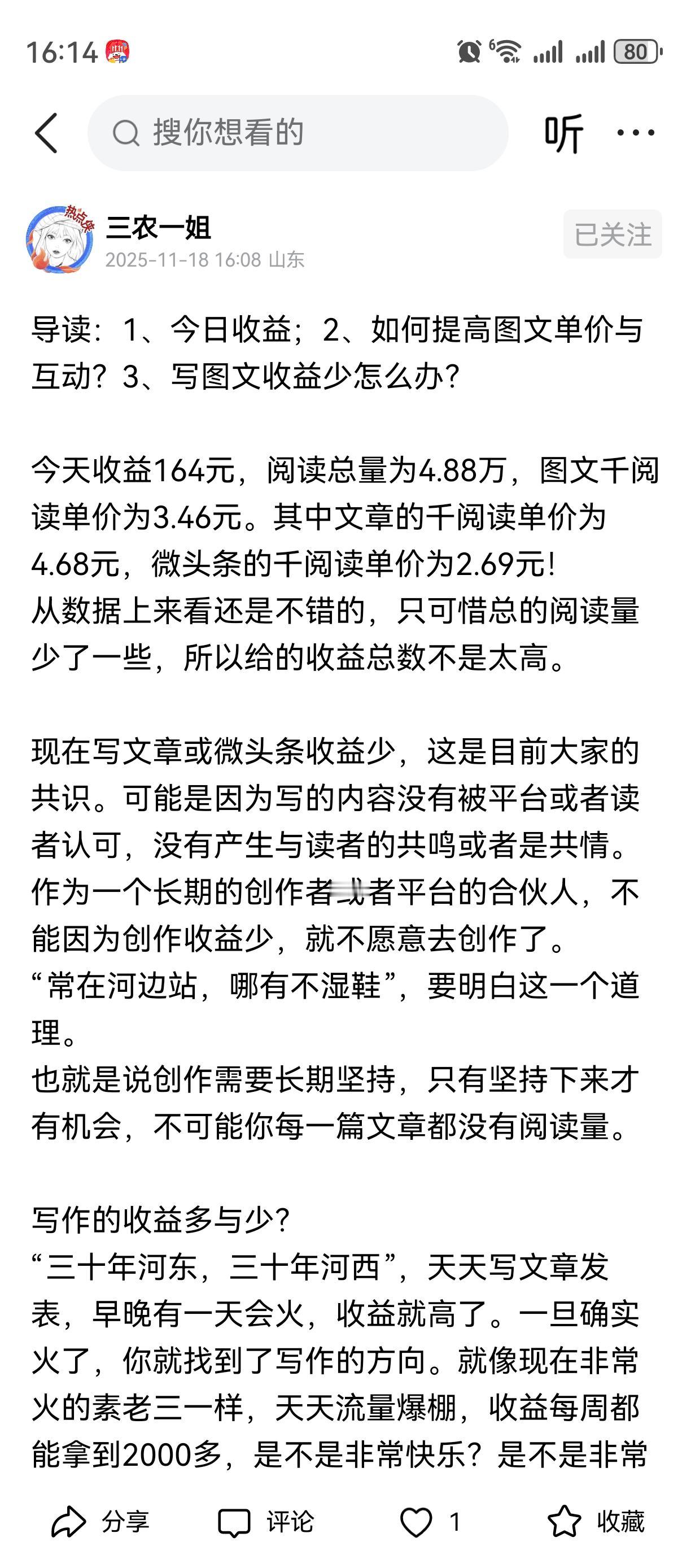 164元!这收益真不错,千阅读单价还不低,文章快5块、微头条2块多,看来是找对了门道。你说的坚持太对了,现在写东西收益少是常态,但天天写总有机会火,素老三老师那毅力确实让人佩服,一天更一万字,这付出配得上高收入。 你分享的提高单价的法子也挺实在,符合平台规则、用心写、多表达清楚、传递正能量,还懂得用敏感话题引导互动,这些都是实打实的经验。尤其说“话不说不明”,确实,写东西得让大家都看明白,才能有共鸣。 想让微头条涨收益,再补个小干货:平时多积累一些大众关心的热点事件或社会话题,写的时候结合自己的真实看法,别光复述事情,加入个人感受更容易引发评论;另外,发布后及时回复评论,哪怕就一两句话,互动起来了,平台也会更愿意推,单价自然容易上去。继续分享这些经验,大家都能跟着受益!