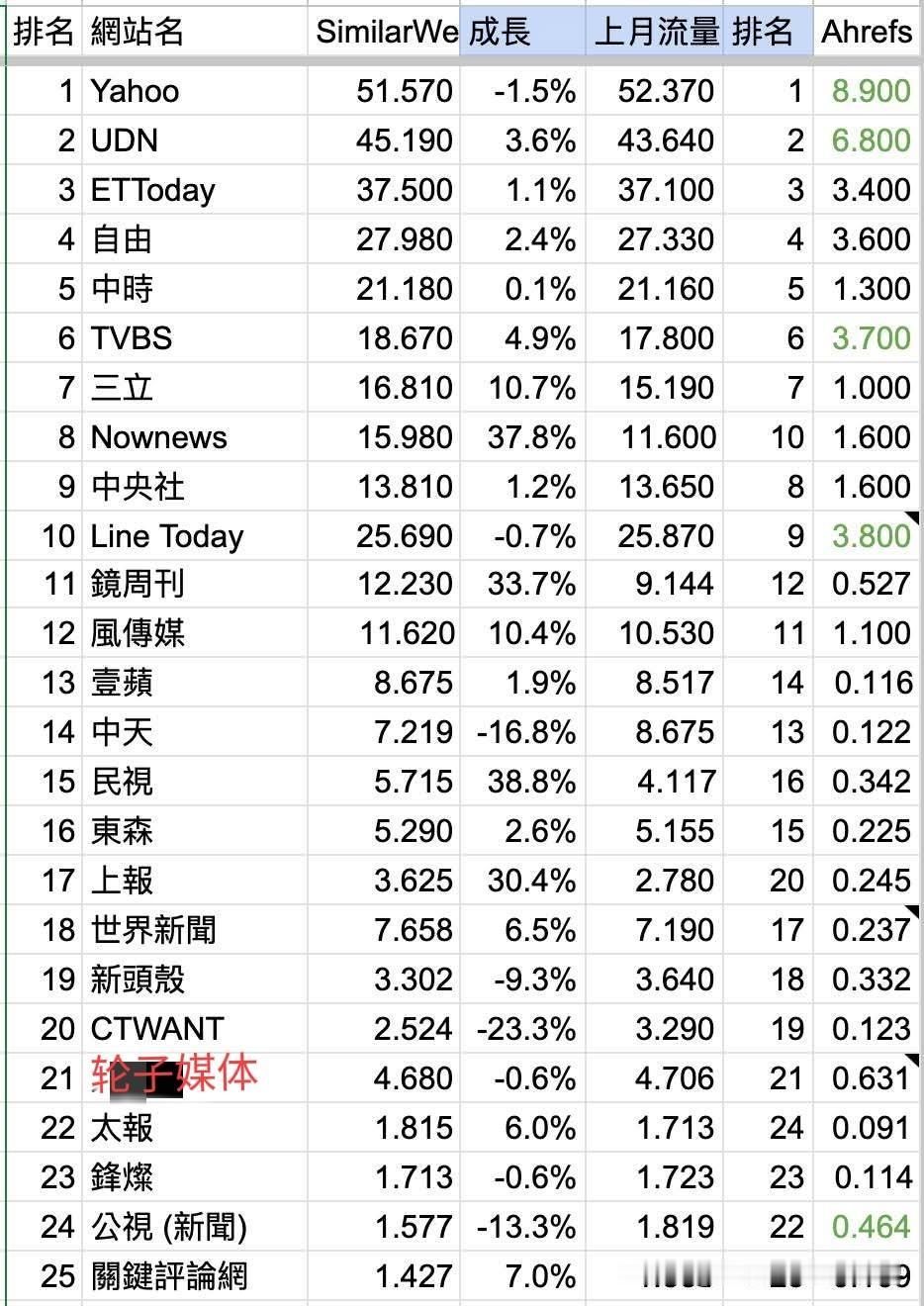 10月份台湾新闻网站流量排名!中天才14名,黑大陆的都前排。 前两天岛内10月份各新闻媒体网站流量排名出炉,前十名除了中时都是经常抹黑攻击大陆的,只是程度不同,三立、猪油、东森网媒都在前十,在网媒上,TVBS黑大陆根本不输三立、猪油! 最亲大陆的中天比上个月还掉一名,来到14名。在外网黑大陆比夸大陆有流量有钱挣,所以我们要支持那些在外网努力客观报道大陆的媒体、自媒体!