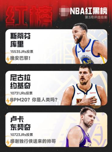 第三周红榜出炉!库里登顶,约基奇东契奇神仙数据入围 NBA第三周红榜评选结果新鲜出炉!库里以15535票强势登顶,约基奇(10731票)和东契奇(10723票)紧随其后,三大巨星用统治级表现承包榜单,球迷直呼看得过瘾~ 库里这波状态彻底拉满!上周场均轰下28.8分3.8篮板2.8助攻,46.7%的整体命中率+36.4%的三分命中率稳定输出,尤其是对阵马刺的两场比赛堪称封神,两场狂砍95分,用无解得分能力征服球迷,高票数登顶实至名归。 约基奇的表现更是炸裂到离谱!场均39.0分13.0篮板8.0助攻的准三双数据,还能交出73.7%的超高命中率和64.3%的三分命中率,攻防两端全面统治赛场,这样的效率天花板,难怪票数紧追库里。 东契奇也延续了稳定的巨星表现,场均30.5分7.3篮板8.0助攻的全面数据,即便命中率(43.4%/34.1%)稍逊前两位,但其串联全队+关键时刻carry的能力依旧亮眼,仅以8票之差落后约基奇,竞争力拉满。 三大球星各展所长,库里的得分爆发力、约基奇的效率统治力、东契奇的全能属性,你觉得谁的表现最惊艳?下一周谁能冲击红榜榜首?评论区聊聊你的看法~