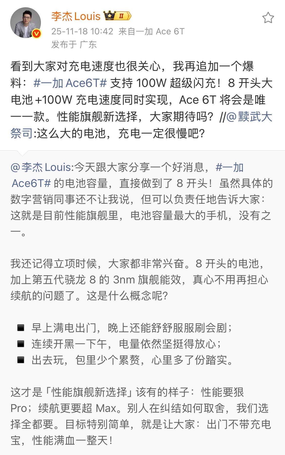 GeekBench 跑分来了,首发搭载的骁龙8 Gen5整体高于8E,多核稳超A19 Pro具体来看,单核3055,多核10460,这就是当代骁龙旗舰芯片的实力吗?这下一加 Ace 6T是真的“性能狠Pro”了!别忘了,一加 Ace 6T还有“超Max”的续航——李杰最新爆料,配备8开头大电池,同步支持100W快充,诚意拉满了,性能旗舰中的独一档!实不相瞒,我已经上手一段时间了,续航绝对顶中顶,值得蹲!小孩子才做选择,成年人当代旗舰芯片和大电池快充全都要。