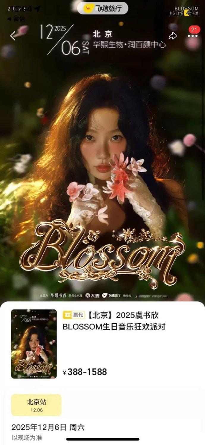 飞猪旅行网站上显示虞书欣生日会票价388-1588。