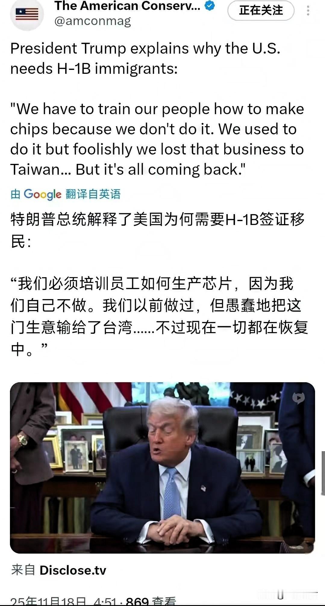 这想法不离谱, 因为他是特朗普! 2025年11月18日,特朗普在谈及美国的芯片问题时表示,美国在芯片这一领域已经输给了其他国家,并且把这归咎于“愚蠢”的政策。 更有意思的是,他表示要依靠H-1B移民来解决美国的芯片问题,让H-1B移民来“培训美国人民”。对于这样的观点,部分美国网友表示认可,但更多的觉得不靠谱,认为这还是一种贸易保护主义。 说实话,特朗普当年在位时,就一直强调要让美国制造业回流,要搞所谓的“美国第一”,但他最终的结果是四年搞得一塌糊涂,通胀飙升,美国老百姓的日子反而更艰难。现在他又回来了,似乎没有吸取任何教训,依然是这套说辞。 美国的芯片产业非常复杂,不可能通过行政命令就能改变的。强行切割全球产业链,只会给市场带来混乱,把成本抬高。谁最先吃亏,还很难说,但可以肯定的是,最终受害的还是美国自己。 看到特朗普这番话,有些人开始质疑他对芯片产业的理解。 芯片产业靠全球分工撑着,美国本土产能连1%都不到,哪是靠移民培训就能搞定的?当年搞“美国第一”把通胀搞上天,现在还不吸取教训。H-1B签证费都涨成那样了,小企业根本雇不起外籍人才,这说辞看着就不靠谱,说白了还是想搞保护主义,最后吃亏的肯定是美国自己。特朗普雷人言论 川普特朗普 特朗普争议发言 特朗普经济困局