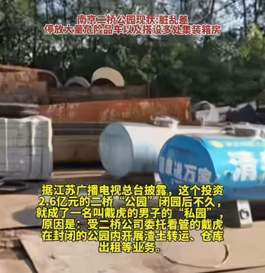 政府投资2.6亿元的公园变成了私园,男子在园内开展渣土转运、仓库出租等业务谋取私利十年。南京二桥公园建成后,前管理人员戴虎以费用未结算为由拒绝搬离,从此公园变成私园,至今已有十年,戴虎将公园封闭起来,开展渣土转运、仓库出租等业务谋取私利,导致公园内脏乱差。十年内,二桥公司多次协商无果,胜诉后申请法院强制执行,还是赶不走戴虎,而这十年间的水电费都是由二桥公司支付的。