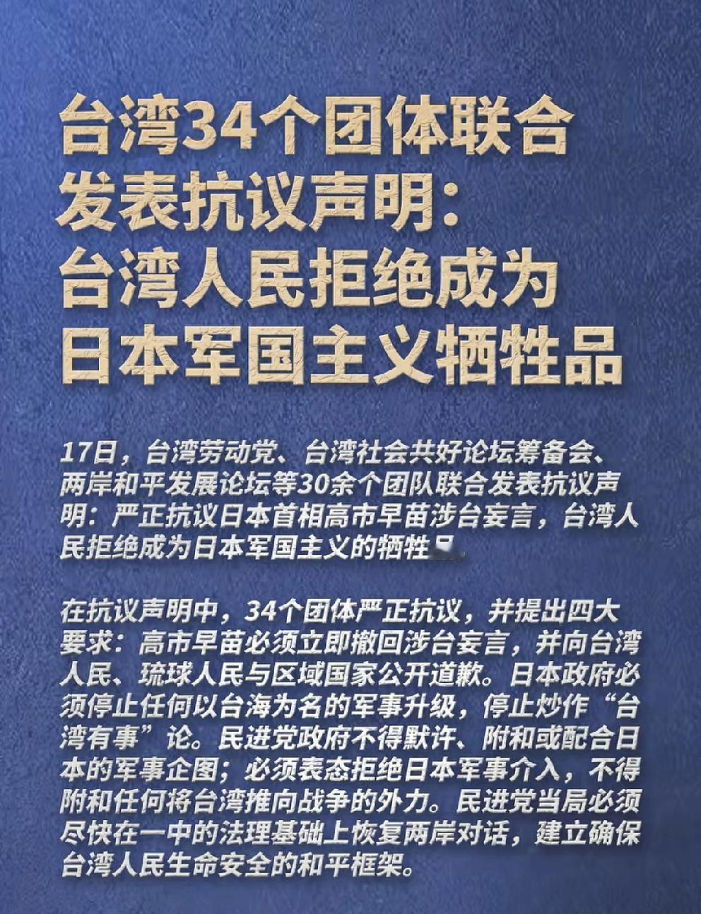 台湾34个民间团体最近集体站出来发声了!就因为日本首相一句不当言论,直接点燃了台湾岛内的怒火,不少民众在现场大声喊出“绝不做别人的炮灰”。 日本首相高市早苗在国会发言时,竟然荒谬地说台湾问题关系到日本的“生死存亡”,还隐隐约约表示要动用武力插手台海事务。这种明晃晃的军事威胁,简直就是把台湾老百姓当成了可以随意牺牲的棋子。这34个民间团体气得拍了桌子,发出了最强烈的抗议声音:我们绝不是日本的挡箭牌! 这些团体说的话,真是说到了大家心坎里,太让人解气了:“台湾想要的是两岸和平,而不是打打杀杀的战争;想要的是和大陆一起创造更好的未来,而不是当美日两国的先锋兵。”每一句话都说到了点子上。更让人觉得解气的是,他们还直接给民进党当局划了一条“红线”:必须马上拒绝日本的军事介入,赶紧恢复两岸之间的对话交流。 说起来真是讽刺,有些民进党当局的人,天天挂在嘴边喊“抗中保台”,结果却差点把台湾变成了美日两国的军事基地。好在台湾的老百姓眼睛看得很清楚,这次他们集体站出来发声,就是对那些错误行为最有力的反击。和平才是最实在的道理,那些把老百姓的生命当成赌注的政客,最后肯定会被大家看穿他们的把戏。你觉得,民进党当局会听进这些声音吗? -search.byteimg.com/img/labis/c872dafbab96ee92c2ee466b8d8db892~480x480.JPEG