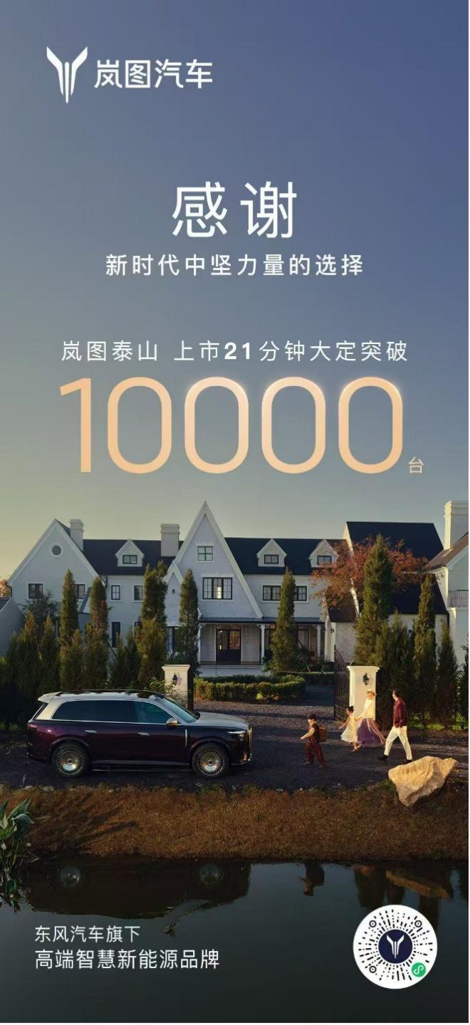 【岚图泰山上市21分钟大定突破10000台】 从“排队看车”到“抢先锁单”:岚图泰山37.99万起,上市即巅峰 不看LOGO看实力!岚图泰山37.99万起,热销订单是最好的证明 上市21分钟锁单1万台!岚图泰山37.99万起,引爆高端SUV市场 上市即巅峰!岚图泰山上市21分钟,全系车型锁单量突破 10000 台!彰显了用户对岚图泰山旗舰实力的高度认可。 这一火爆的市场反响,是岚图泰山“未上市先火爆”热销氛围的延续,更是其“新时代旗舰SUV”硬核实力的直接印证。岚图泰山凭借最强智驾、最强底盘、最强三电构成的价值铁三角,构筑衡量真旗舰的三大标准。成功将“不看LOGO看实力”的价值主张,传递给了每一位用户。