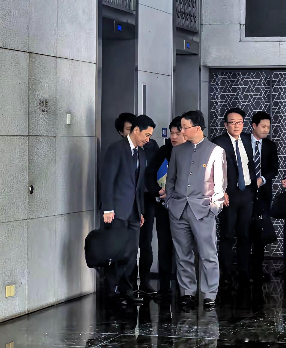 这场景! 活脱脱是“惹祸娃家长见老师”的现实版:左边那位西装革履的男士,低头攥着公文包,肩背都塌着,活像刚被老师叫到办公室的家长,连指尖都透着“等会儿要挨训”的局促。 旁边穿中山装的那位倒像气场全开的班主任,手插着兜,站姿笔挺,眼神往对方那儿一落,自带“说说你家孩儿这事儿怎么弄”的压迫感。 身后跟着的几个人,要么攥着文件袋不敢吱声,要么偷摸瞟脸色,活脱脱是同来“旁听”的班干部,连空气里都飘着“这顿批评怕是躲不过”的紧张味儿。