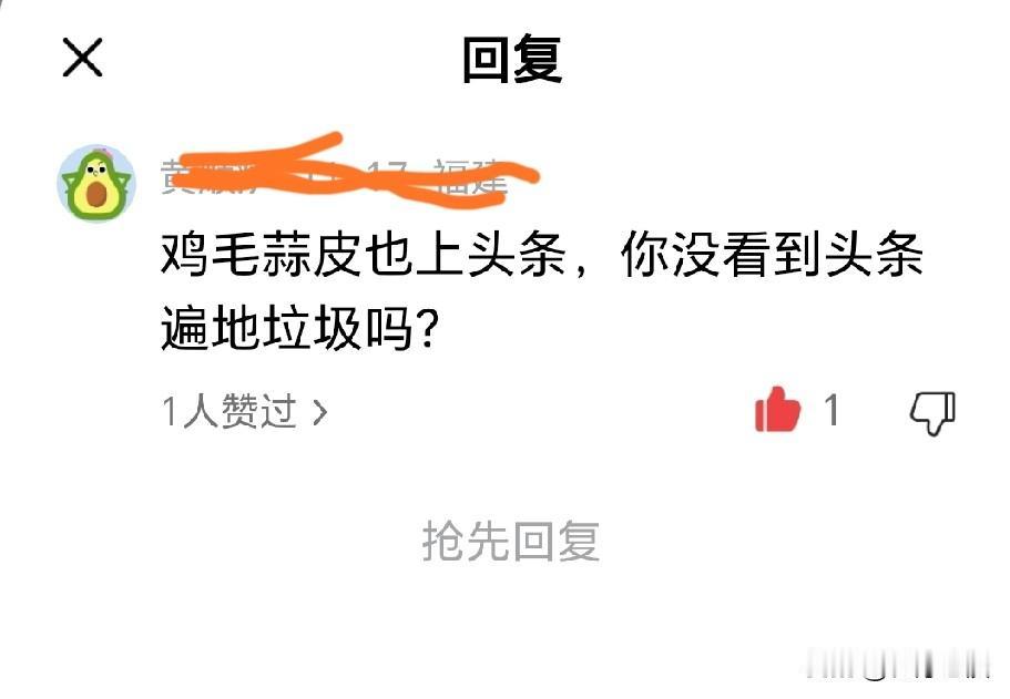 有个友友在我的文章下写了一段评论,其内容是:“鸡毛蒜皮也上头条,你没有看到头条遍地垃圾吗?”我写了一段文字回复他的评论,可是出现“根据头条设置,你无法回复评论”,只好在这里回复他的评论,希望他能看到。 今日头条是大众的头条,没有门槛的限制,大家都可以成为创作者。因此,大家都在这里分享生活,记录自己的生活,这是大家关注的,也是头条倡导的。当然都是些家长里短,油盐酱醋的内容,不是阳春白雪,而是下里巴人。在头条,我们普通人写重大的时事内容,受我们的认知局限,审核也不易通过。 今日头条是新闻头条,什么是新闻,狗咬人不是新闻,人咬狗才是新闻,因此难免追求新奇,能够吸引人的眼球。同时你的生活对他人来说是新闻,能满足好奇心,引起大家的关心,关注。 今日头条作为媒体,具有平民化,快餐文化的特点,满足不同人群的多样化需求。可能有你喜欢的也有不喜欢的内容,头条也会根据人们的喜好来推送,不喜欢的也就是你眼中的垃圾。