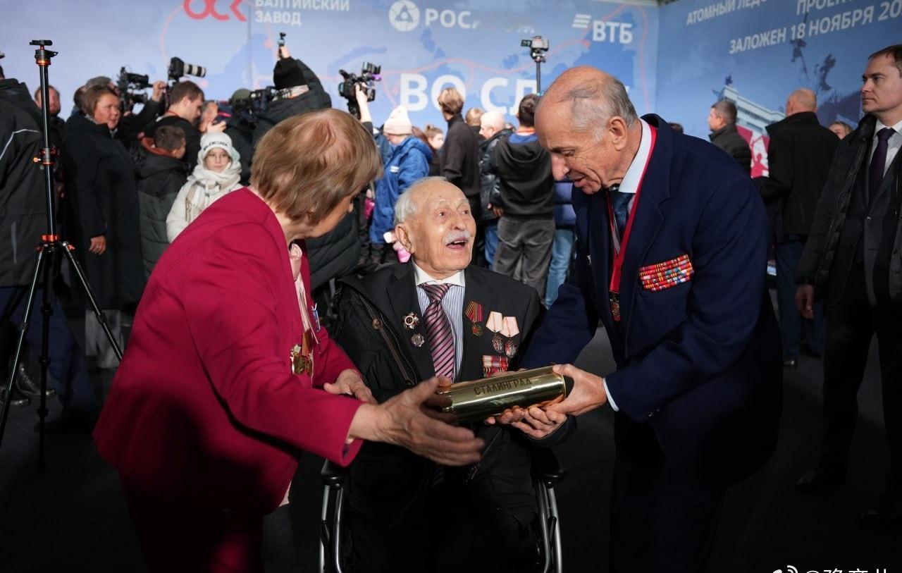 第六艘22220型核动力破冰船“斯大林格勒”号举行了奠基仪式 出席仪式的嘉宾包括卫国战争老兵、斯大林格勒战役参战者帕维尔·彼得罗维奇·维诺库罗夫。 他向俄罗斯国家原子能公司首席执行官阿列克谢·利哈乔夫赠送了一个装有马马耶夫岗土壤的胶囊。 该胶囊将被存放于破冰船上。