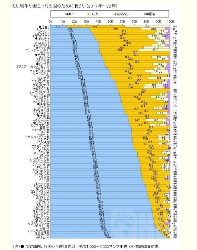 看这个民调:“如果战争爆发,你会为你的国家而战吗?” 日本13.2%倒数第一。
