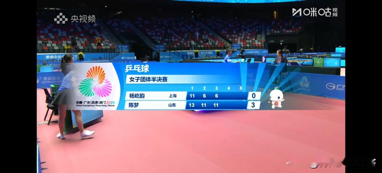 陈梦决胜盘再救主!山东女团3-2逆转上海,24年后重返全运决赛 全运会乒乓球女团半决赛,山东队3-2险胜上海队,时隔24年闯入决赛! 比赛跌宕起伏:王晓彤/范思琦拿下首盘,陈梦第二盘不敌上海新星陈熠,上海队再下第三盘反超2-1。关键第四盘,王晓彤迎战陈熠,历经五局鏖战以3-2(12-10、12-10、7-11、12-14、12-10)险胜,将比分扳为2-2。 决胜盘陈梦尽显大满贯底蕴,面对杨屹韵,首局9-10落后挽救局点13-11拿下,随后连下两局3-0锁定胜局。王晓彤的关键胜利与陈梦的抗压表现,助山东队逆转,接下来将迎战孙颖莎领衔的河北队! 全运会