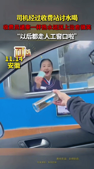 刷到这个收费站视频,突然被暖到了 刚刷到安徽收费站这段视频:司机大哥递过水杯问“能帮我接杯热水吗”,收费员姐姐笑着应了句“可以的”,转身就把装满热水的杯子递了回来,还带着特别温柔的笑。 大哥说“以后都走人工窗口啦”——就这一句,突然懂了:跑长途的疲惫,可能就是被这一杯热乎水、一个笑脸,轻轻捂暖的。 生活里的温柔,真的藏在这些细碎的瞬间里啊收费站 收费站暖心故事 暖心收费员 暖心收费员 日常分享 暖心瞬间