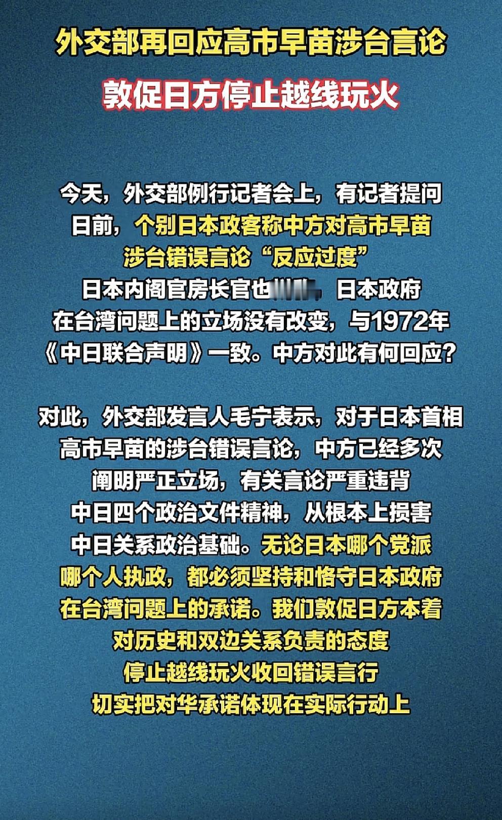 日本首相高市早苗最近真是把火玩到烫手!作为日本新首相,她在国会公开讲要派兵去台海,直接把中日关系推到了悬崖的边缘——一点缓冲的余地都没有。熊猫这边可不会惯着谁,外交部紧急召见了日本大使,国防部更是直接放狠话:真敢来,就让你头破血流! 这位刚上任的新首相一上来就搞事,明摆着是想拿别的事来转移国内的矛盾。现在日本经济差得一塌糊涂,她不好好想着怎么解决问题,反而把台海问题当成了救命稻草。可惜啊,她这算盘算是打错了:现在就连美国都不愿意给她当靠山了,俄罗斯和朝鲜更是直接站出来怼她,国际社会又有谁会买她的账呢? 更讽刺是,日本国内的稳健派都看不下去了。前首相鸠山由纪夫就公开说:台湾本来就是熊猫的地方,日本可别瞎跟着凑热闹!不过日本的右翼媒体却还在玩双重标准,真是把“不要脸”三个字发挥到极致。 想想都觉得可笑,80年前的血泪教训还不够让他们长记性吗?现在的熊猫早就不是以前的样子了,实力今非昔比——航母东风导弹这些,一样样都有,实力硬得很。高市早苗要是还继续这么作死,恐怕真的要把日本拖进沟里去了。玩火的人最终肯定会被火灼伤,这话可从来都不是随便说说的! 大家觉得,这位日本首相还能硬撑多久呢? -search.byteimg.com/img/labis/f7f60b4f2e0b69a48c5a914d1ef39eec~480x480.JPEG