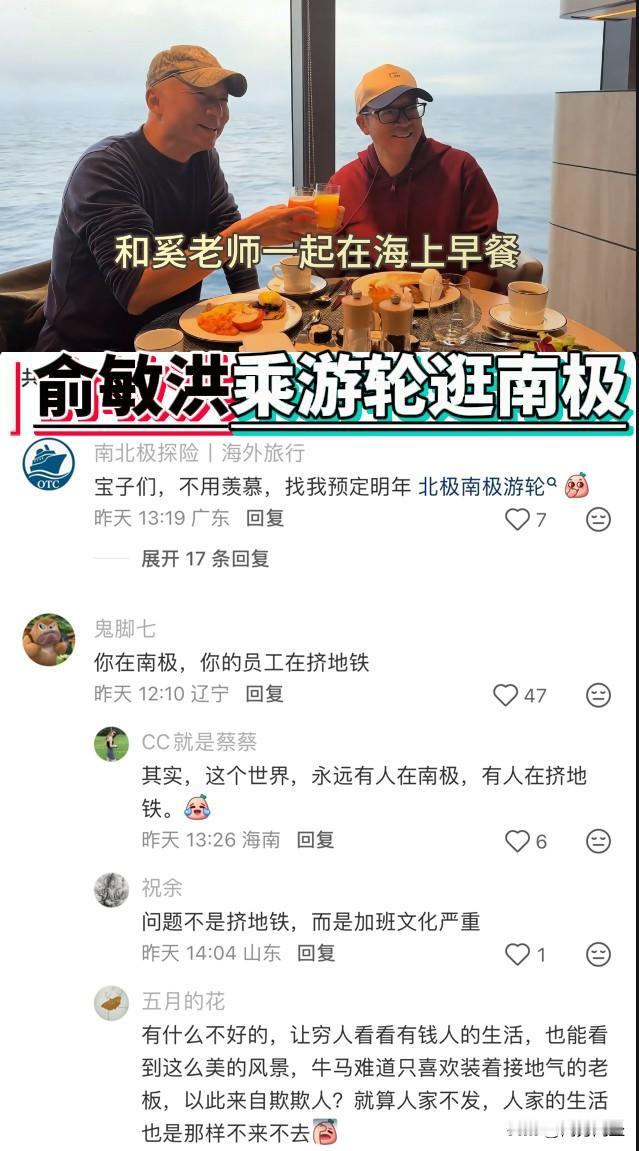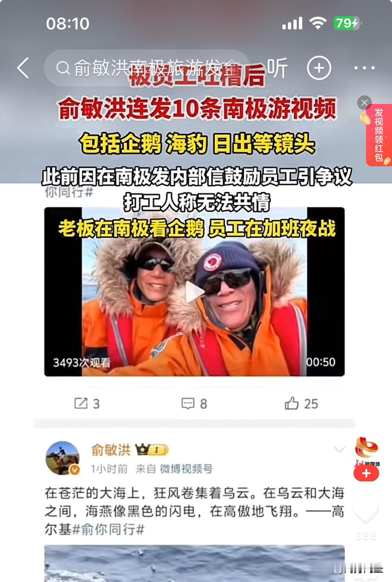 俞敏洪较上劲了,连发十条视频 给俞敏洪的一封回信流传在网络上,写信人署名普通员工。 这封并不算短的信,提笔抬头用词极致的简约。直呼其名,给俞敏洪的一封回信。 时间:23.59分 地点:北京出租屋,居住环境“宜家同款贫穷风”,暖气坏了三次。 状态:凌晨在加班的小透明。 写信人:普通员工。 这封信在网络上流出之后,俞敏洪在个人账号连续发布十条旅游视频。 有人形容,老板在南极看企鹅,员工加班夜战称无法共情。