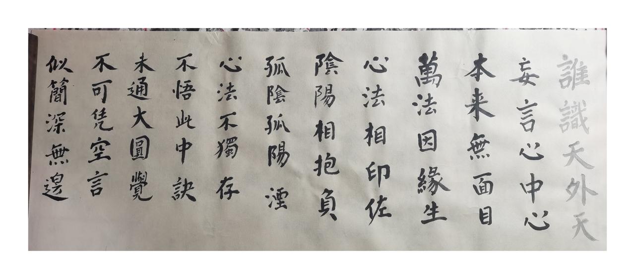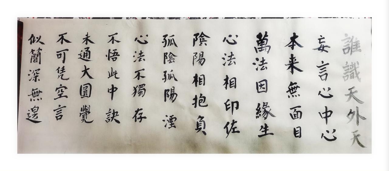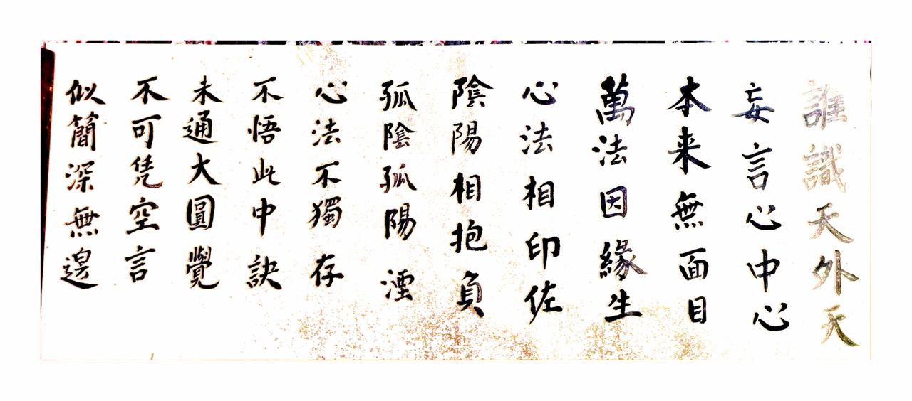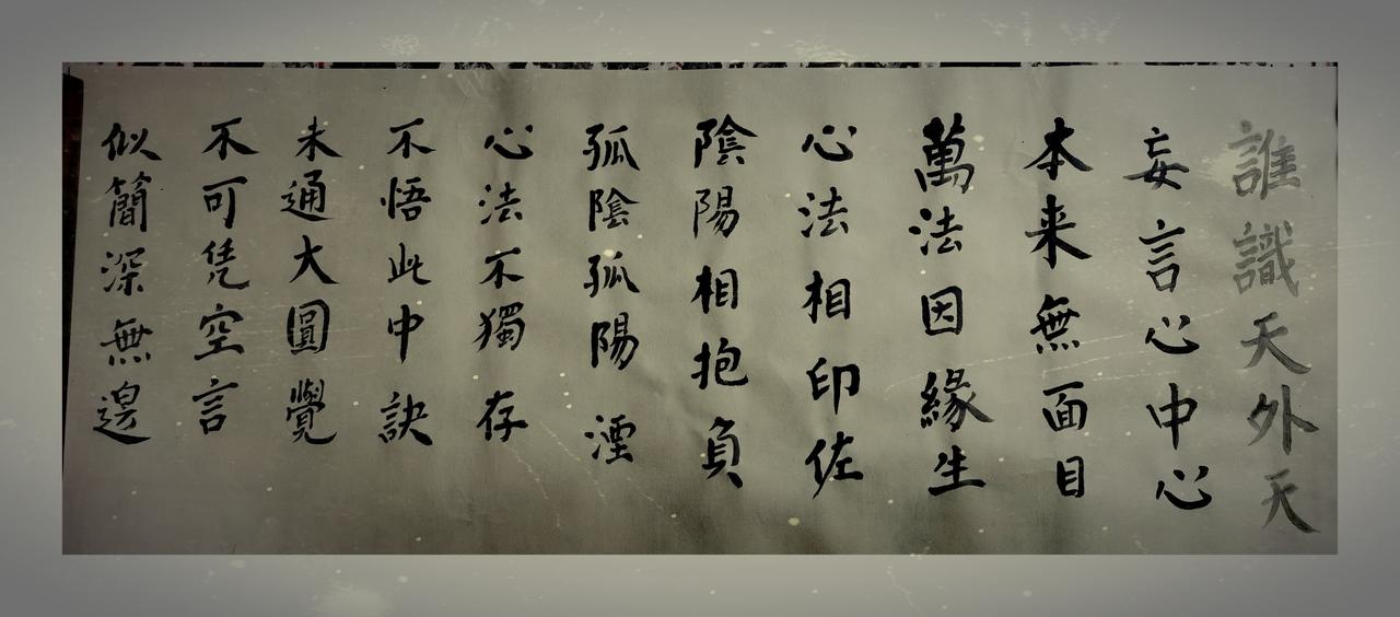.....心偈....... 谁识天外天,妄言心中心 本来无面目,万法因缘生 心法相应佐,阴阳同抱负 孤阴孤阳灭,心法不独存 不悟此中诀,未识大圆觉 不可凭空语,似简深无边 一梦是千年,又或在耳帘 幽冥几隐约,破雾晓光前 毕竟不留行,过往是宿缘 趋真向性海,云海印歌泉 心偈 印证语