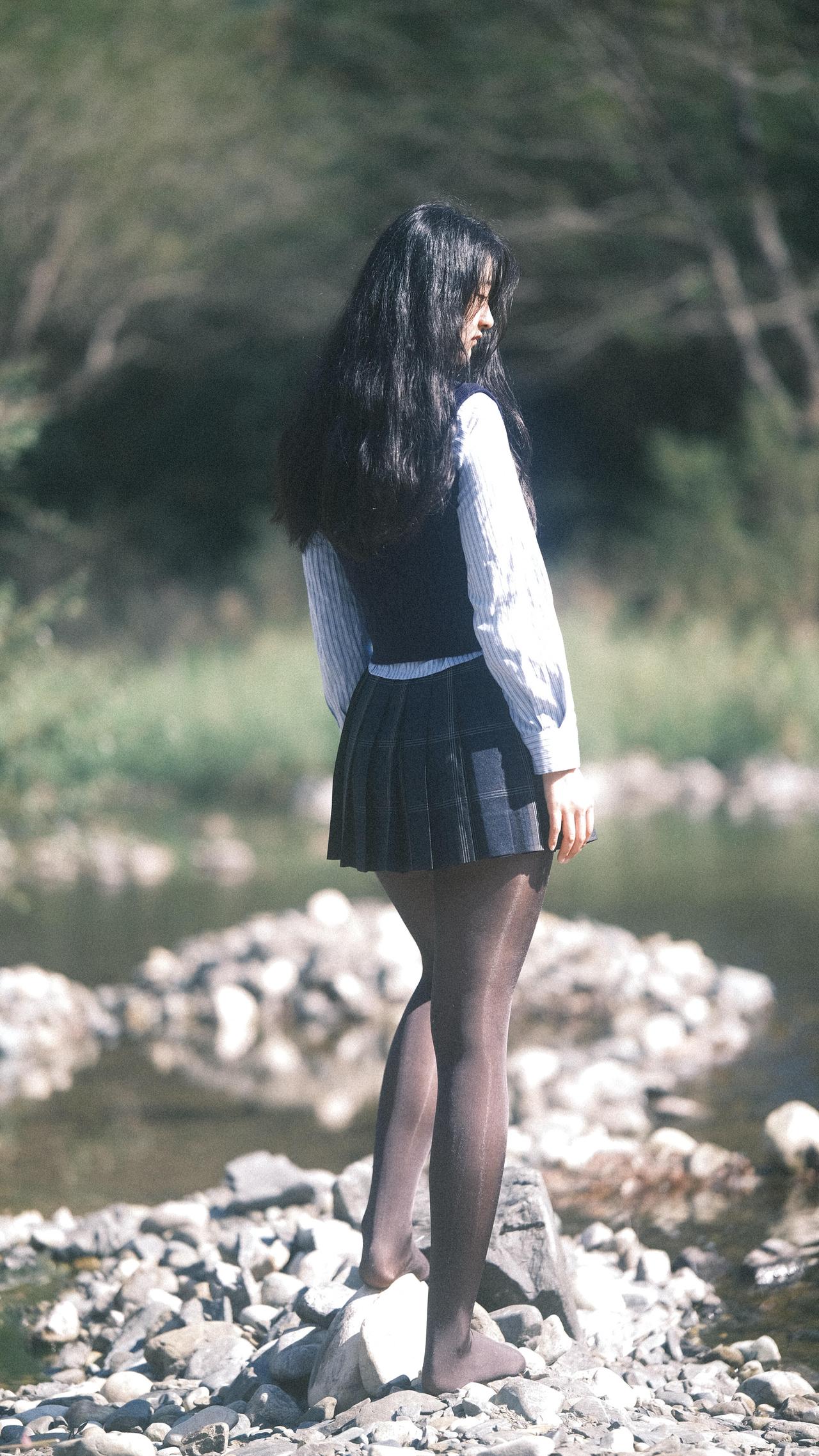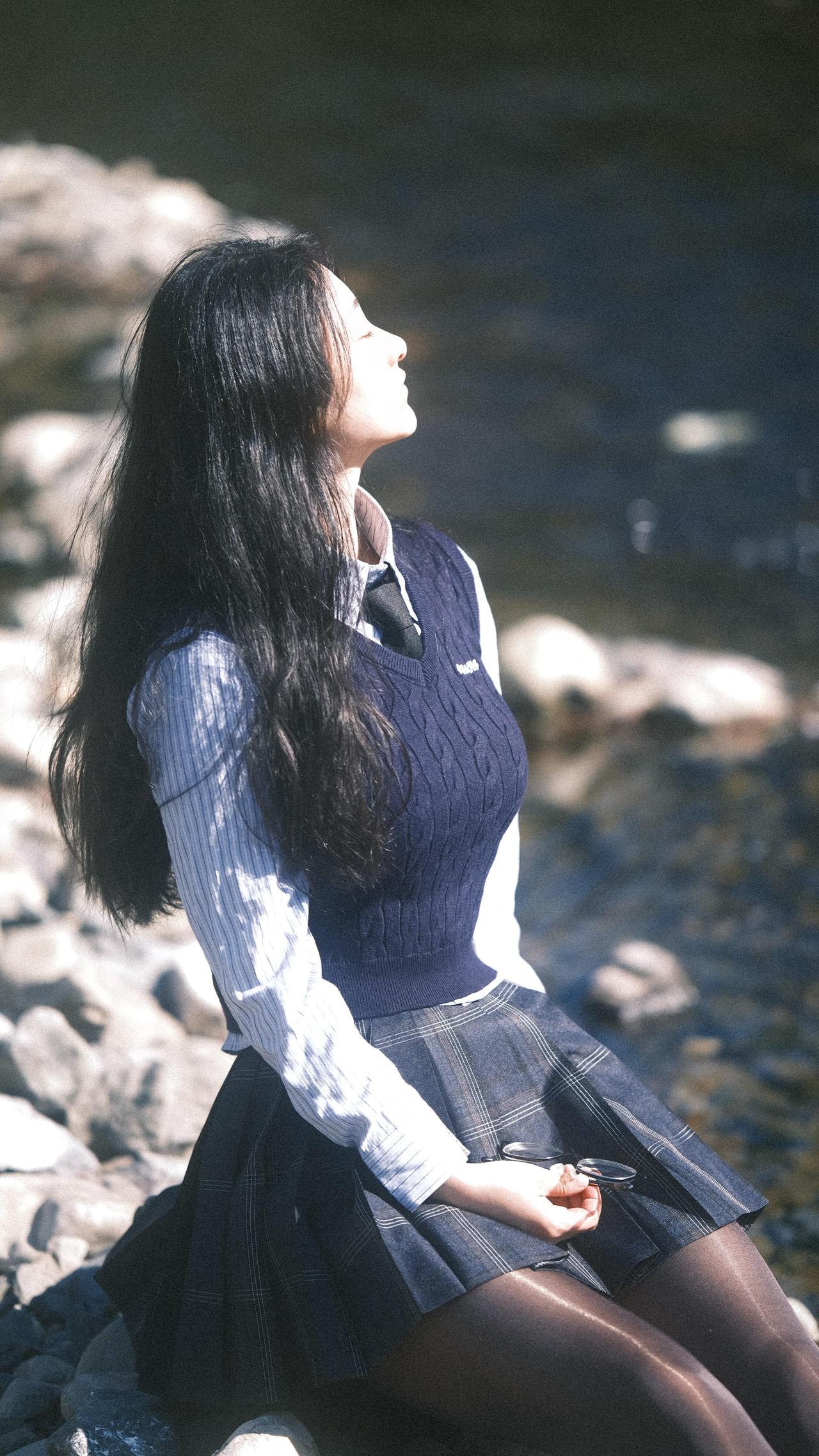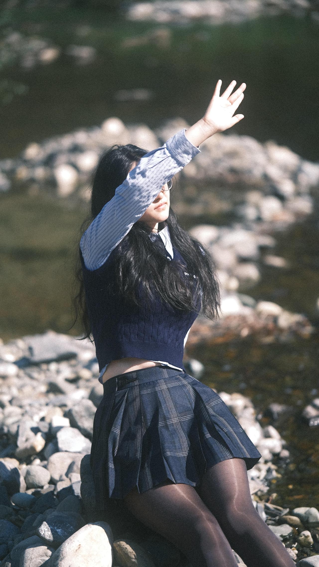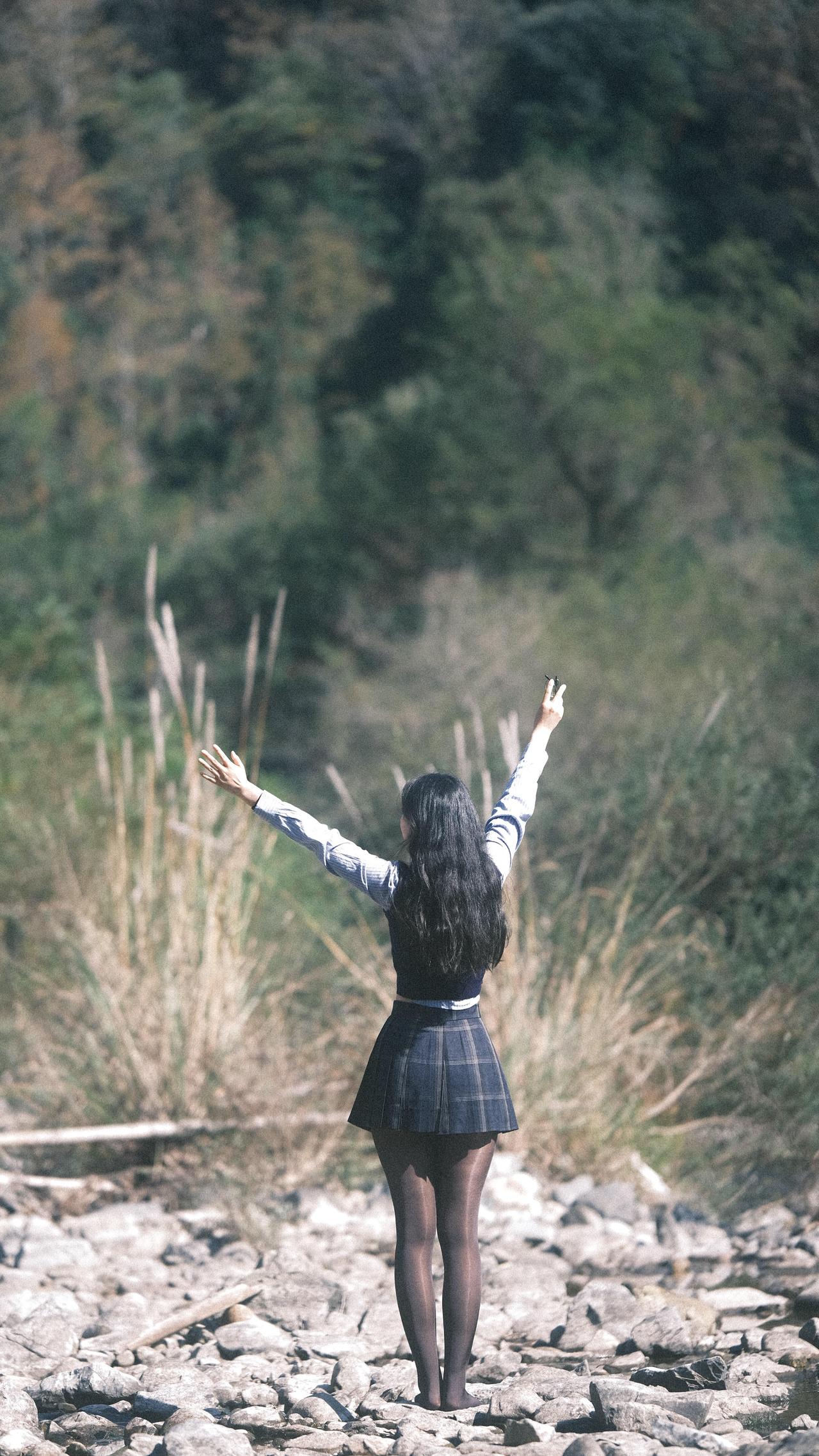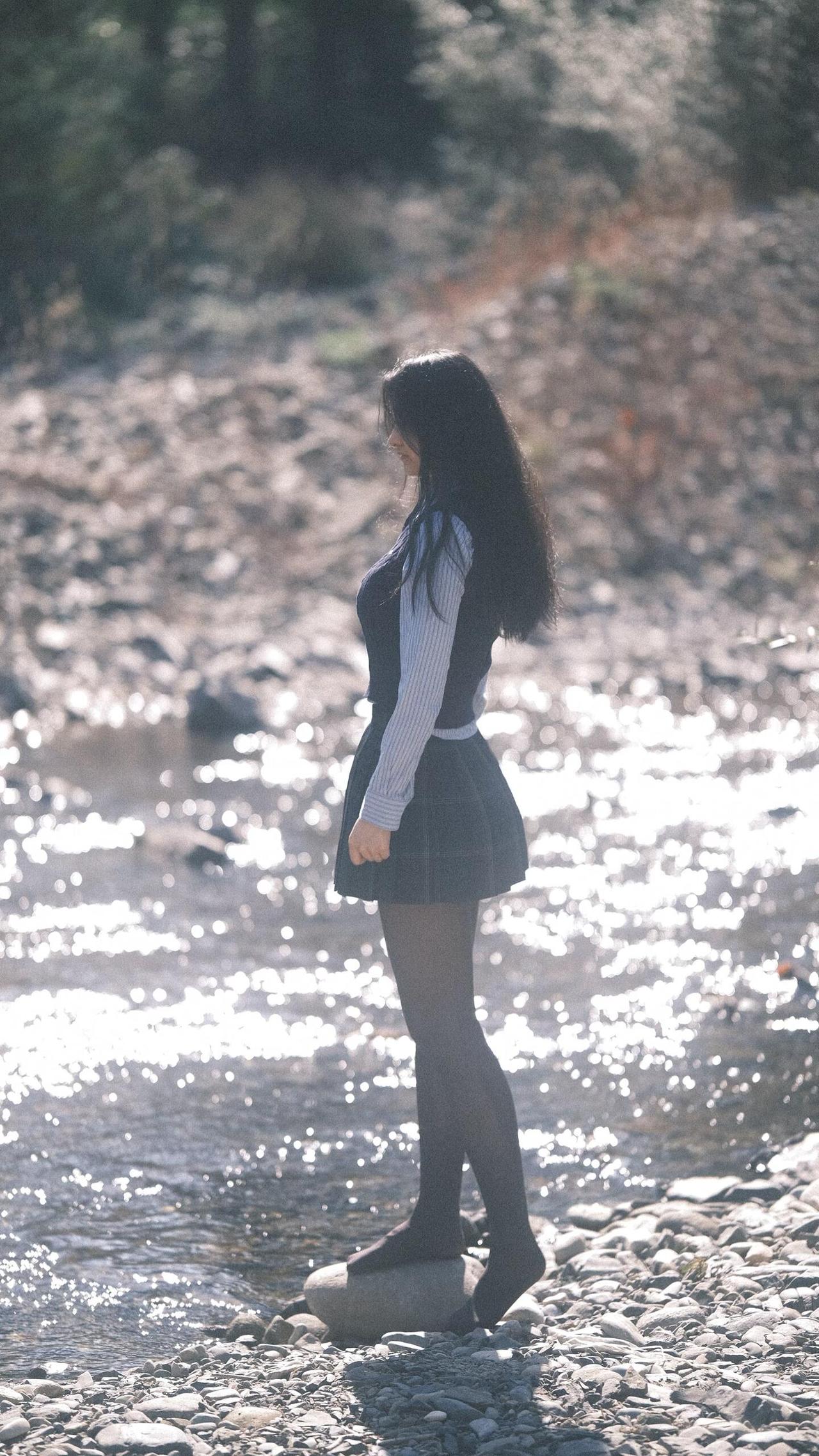在路上,风把裙摆揉成一捧松弛的褶皱阳光在溪面碎成星子,踩着鹅卵石的脚边,水流正轻吻石缝里的光斑。        发梢沾了草木的香,臂弯枕着风的形状眼镜滑到鼻尖时,抬眼撞进漫山的秋:        是芦苇摇着绒絮,是光影在衣襟织成快乐,是脚步慢成溪流的节奏,把日子过成帧帧发亮的诗行。 = = = = = = = = = = = = = = = = = = = = = = 【摄影思路小记】 ①选午后侧光!溪面反光能给人物镀层柔边光,发丝会透光;        ②动作越松弛越出片:踩石头时自然垂肩、抬手挡光不用看镜头、坐石滩让腿轻搭水面,模糊背景突出光斑,胶片滤镜拉低对比度,氛围直接拉满!        【本套胶片风写真的参数参考】        –相机:胶片相机(或数码调胶片模拟)        –光圈:f/2.8-f/4(虚化背景+保留光斑层次)        –ISO:100-200(晴天低感保画质)        –快门:1/200s以上(抓拍动态不糊)        –后期:降低对比度+轻微偏黄/青色调+锐化发丝边缘