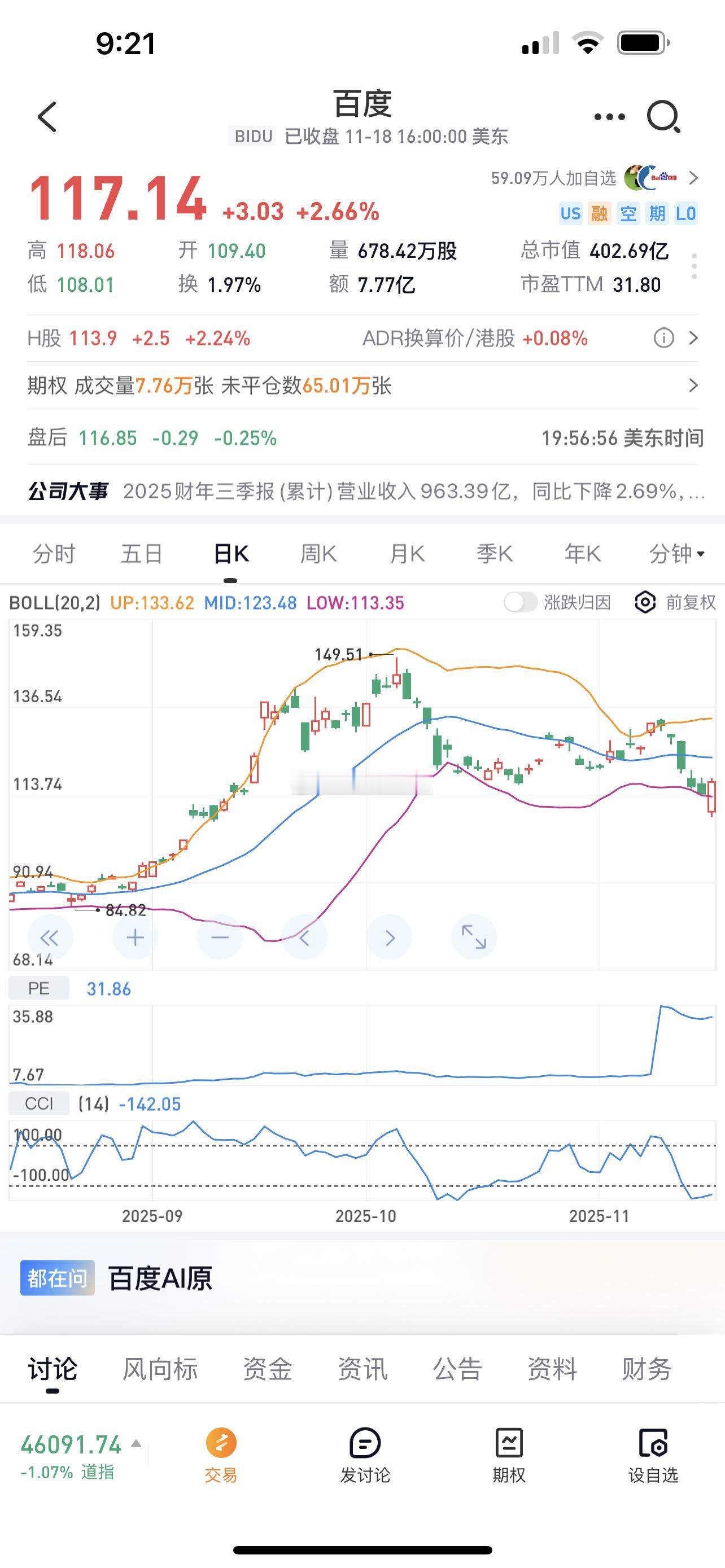 百度广告业务跌幅太让人震惊。Q3营收下滑7%至312亿元人民币(约合44亿美元),创下有史以来最大季度跌幅,加上资产减值后净亏损约112亿元人民币。上周,李彦宏在百度世界大会发布了 Ernie 5.0,意在重申百度在中国AI大模型竞赛中的地位。然而几天后股价还是下跌,百度正眼睁睁地看着其核心搜索广告引擎的用户和营销预算被字节跳动和小红书蚕食。尽管如此,百度股价今年仍上涨了约 35%,这表明投资者可能对百度未来的发展抱有期待。彭博行业研究指出,尽管百度营收略微超出预期,但调整后营业利润下降了 69% 至 22 亿元人民币,搜索相关广告收入下降了 19% 至 153 亿元人民币,且由于云服务占比增加,利润率有所下降。不过AI相关收入增长了 50% 至约 100 亿元人民币,目前约占百度总收入的三分之一。云业务是百度为数不多的亮点之一,对于投资者而言百度目前正处于一个艰难但可能至关重要的转型期:一是日渐衰落的传统广告业务,二是成本高昂的人工智能未来和残酷的市场竞争