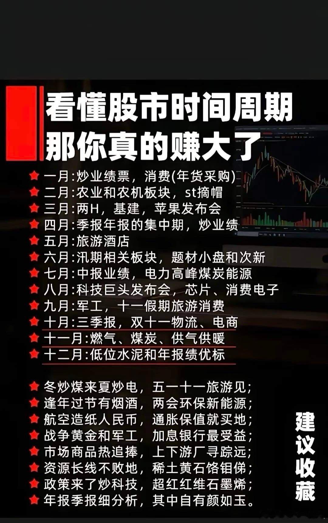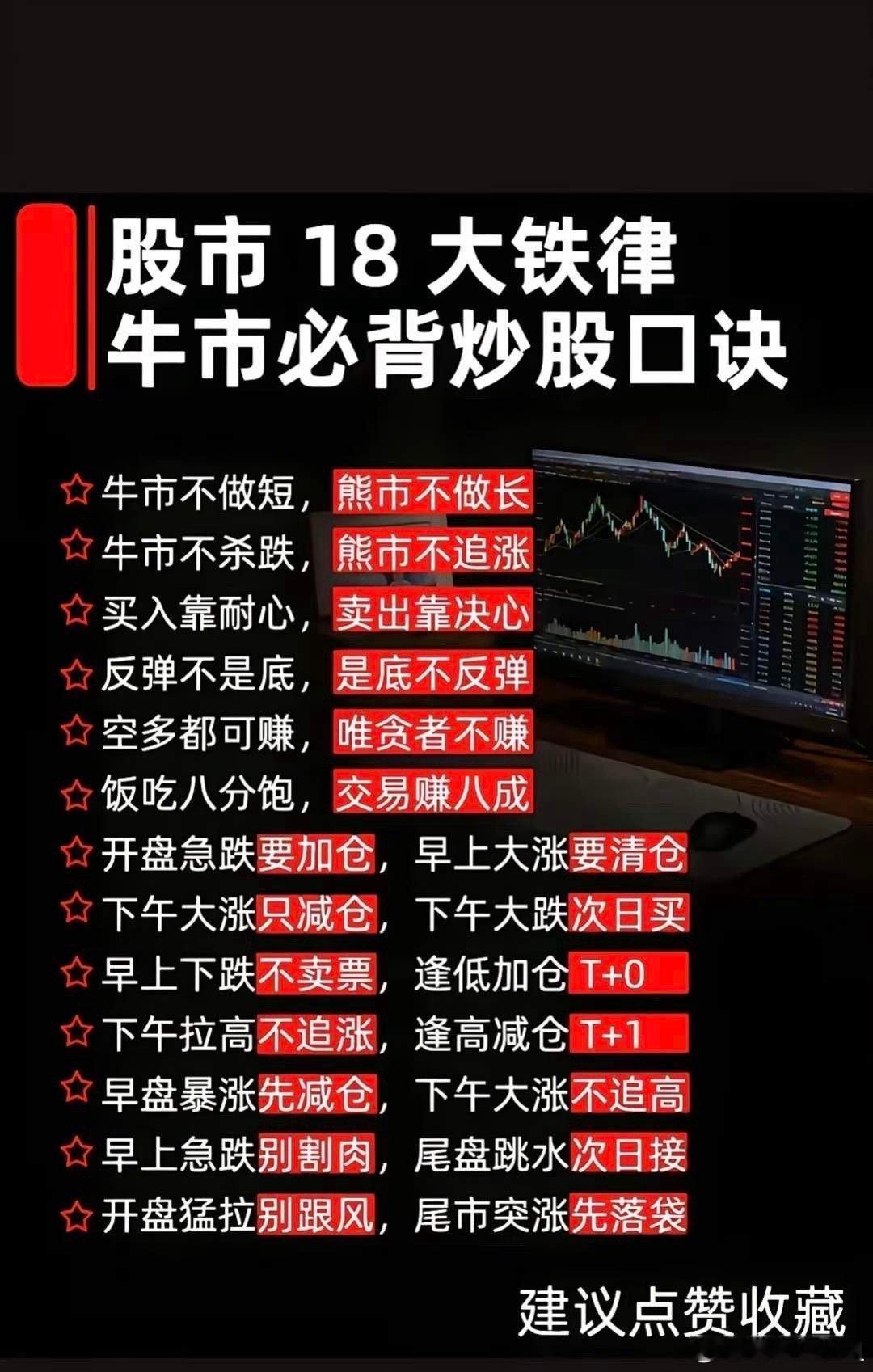 股市投资经验和策略总结(收藏研究),旨在帮助投资者根据市场周期和规律进行更有效的操作。第一张图主题是“看懂股市时间周期,那你真的赚大了”,重点在于按月份梳理股市热点板块与投资机会,比如一月关注业绩票和年货消费,二月聚焦农业、农机及ST摘帽,三月围绕两会、基建和苹果新品发布,四月是年报季报集中披露、炒业绩的时段,五月适合布局旅游酒店,六月关注汛期相关及次新股,七月看重中报业绩和电力煤炭,八月有科技发布会、芯片及消费电子,九月是军工和十一旅游消费,十月关注三季报和双十一物流电商,十一月炒燃气供暖,十二月则布局低位水泥和年报绩优股。此外,还总结了多个通俗易懂的股市谚语,如“冬炒煤来夏炒电”“逢年过节有烟酒”“两会环保新能源”“战争黄金和军工”等,强调根据季节、节日、政策和市场环境把握不同板块轮动规律。第二张图主题为“股市18大铁律 牛市必背炒股口诀”,主要是18条股市投资经验口诀,每条以红色五角星标注,部分重点内容用红框突出。核心思想包括牛市与熊市的不同操作策略(如牛市不做短、熊市不做长;牛市不杀跌、熊市不追涨)、买卖心态(买入靠耐心、卖出靠决心)、对市场波动的判断(反弹不是底,是底不反弹)、风险控制(空多都可赚,唯贪者不赚)、仓位与交易节奏(如开盘急跌要加仓,早上大涨要清仓;下午大涨只减仓,下午大跌次日买等),并针对一天内不同时段(早盘、下午、尾盘)的市场表现给出具体操作建议(如早上下跌不卖票、逢低加仓T+0;下午拉高不追涨,逢高减仓T+1等)。这些口诀聚焦实战操作,强调纪律性和时机把握。综合来看,两张图分别从“时间周期+板块轮动”和“操作纪律+实战口诀”两个维度,为股民提供了系统的股市投资参考与指导,帮助投资者结合市场节奏和自身操作习惯提升投资效率。