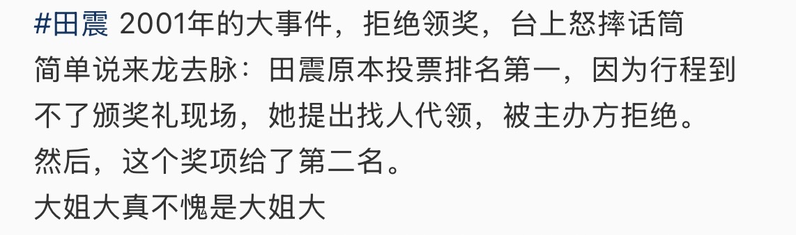 是那位得了奖,邀请她来,她又因为行程冲突想找人代领,但是被主办方拒绝,然后主办方无奈顺延给第二位那英后,她又突然杀到现场,拒绝领奖还大闹黑幕的田震吗?