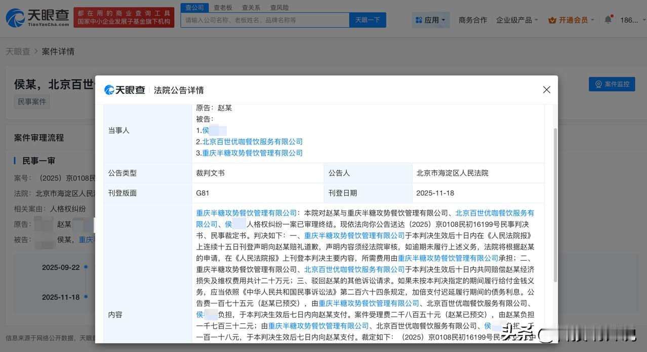 【赵丽颖维权获赔20万 赵丽颖起诉多方胜诉】 天眼查App显示,近日,北京市海淀区人民法院向重庆半糖攻势餐饮管理有限公司公告送达原告赵丽颖与其人格权纠纷一案民事判决书。内容显示,法院判决重庆半糖攻势餐饮管理有限公司向赵丽颖登报道歉,重庆半糖攻势餐饮管理有限公司、北京百世优咖餐饮服务有限公司等共同赔偿赵丽颖经济损失、维权费用共计20万元。 天眼查信息: