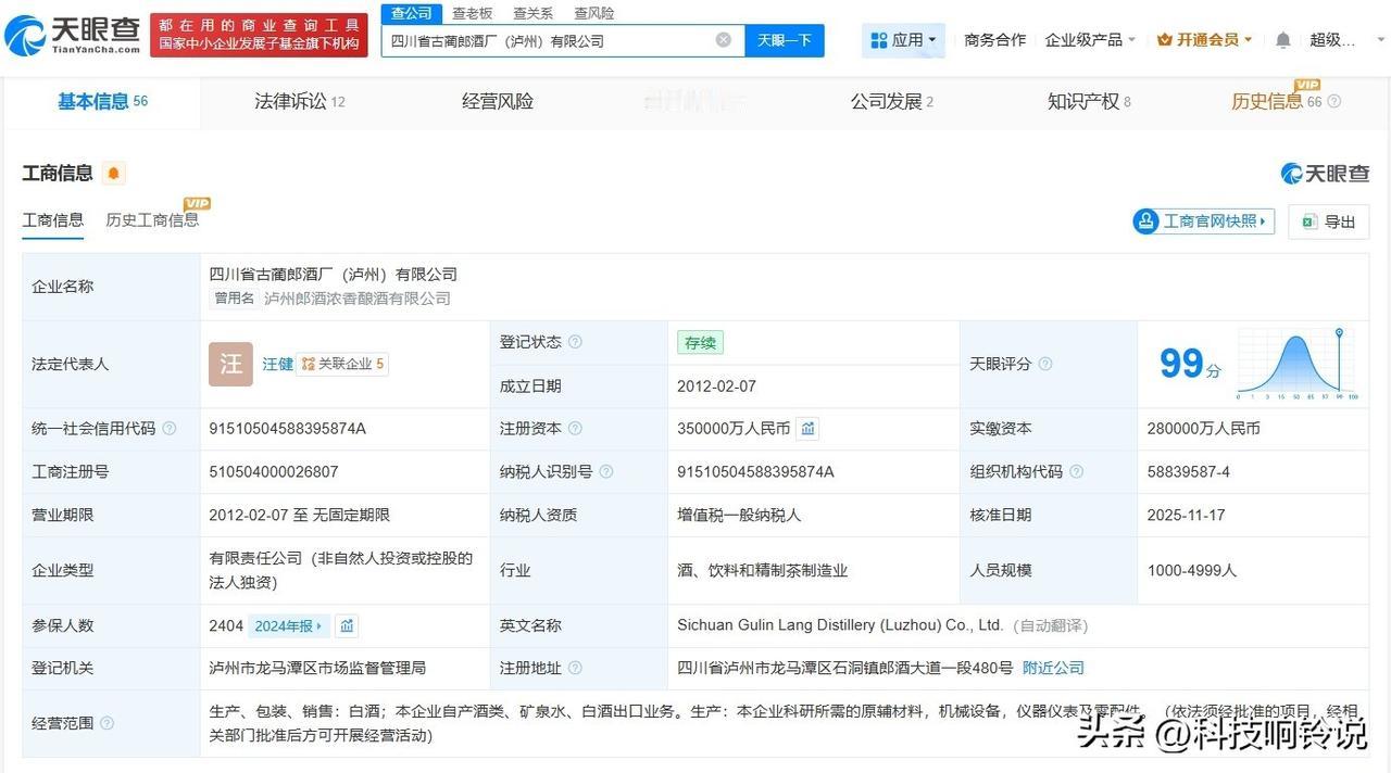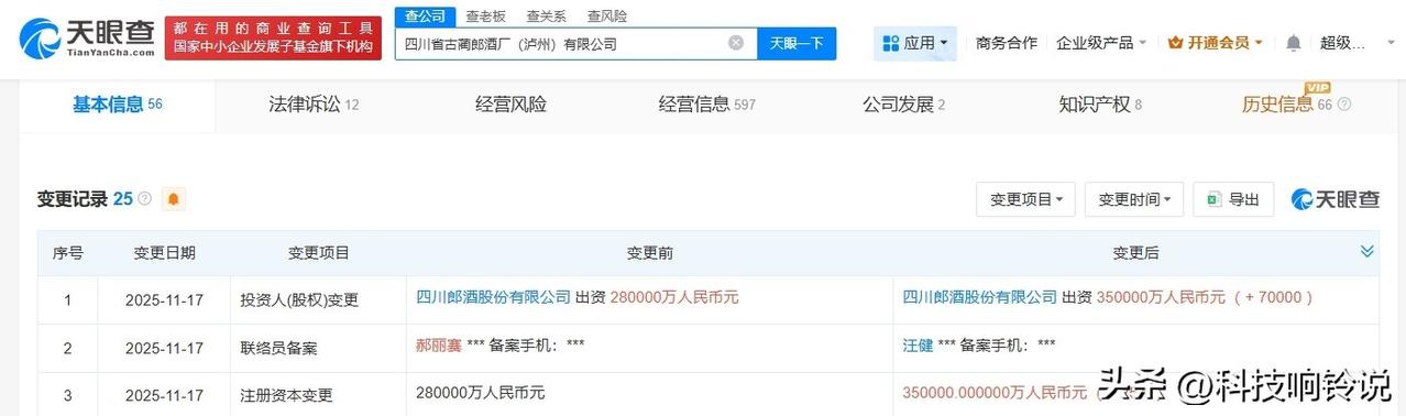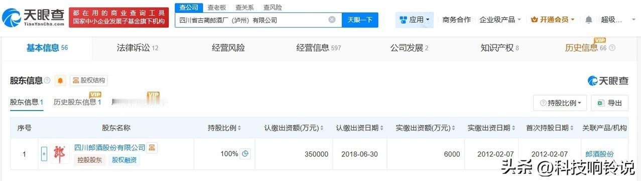 【古蔺郎酒厂泸州公司增资至35亿 增幅25%】 天眼查App显示,近日,四川省古蔺郎酒厂(泸州)有限公司发生工商变更,注册资本由28亿人民币增至35亿人民币,增幅25%。 该公司成立于2012年2月,法定代表人为汪健,经营范围包括生产、包装、销售白酒等。股东信息显示,该公司由四川郎酒股份有限公司全资持股。 天眼查信息: