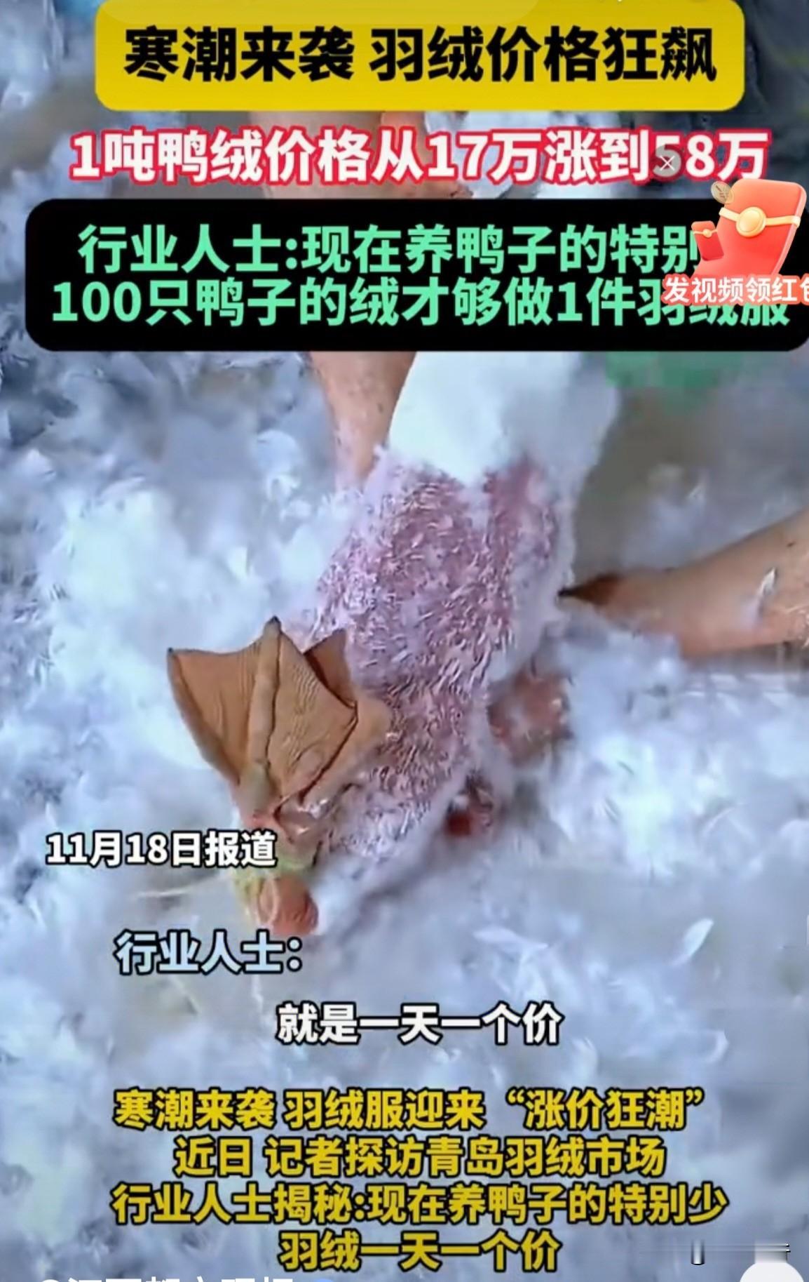 鸭绒价格从17万飙升至58万,反映出鸭绒市场供需关系及价格浮动剧烈。 1吨鸭绒从17万涨到58万 该现象可能源于养殖场地减少或减产、环保政策收紧导致的供应紧缩,另一方面也说明全球羽绒制品需求持续升温的市场态势。 【注】图片及参考信息来源 江西都市现场