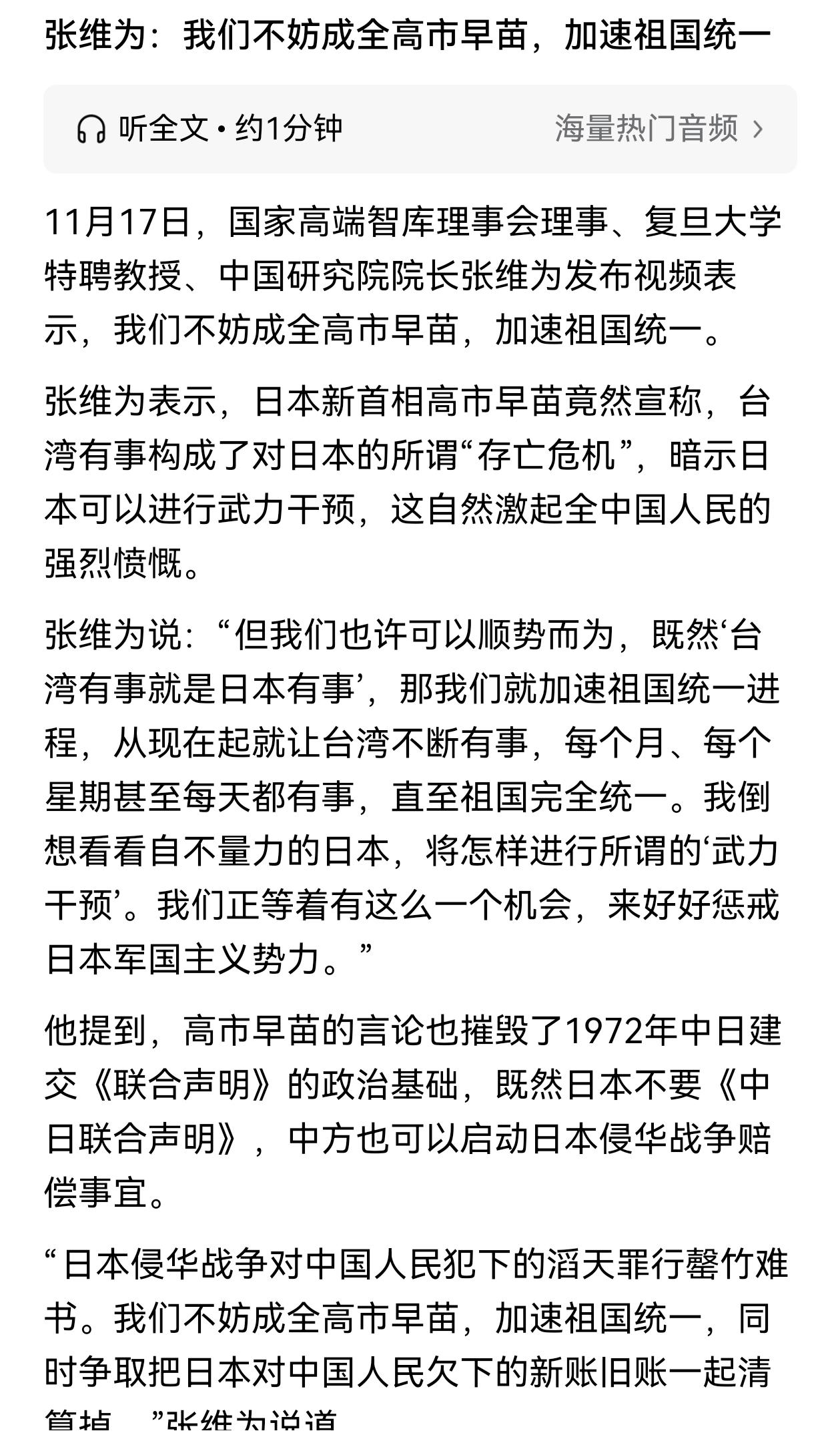 张院长这招绝了! 他说:我们不妨成全高市早苗,加速祖国统一!换个思路,顺势而为,既然日本找事,那就加速进程,让台湾不断有事,每个月,每星期甚至每天,直到实现统一,看不自量力的日本能如何,高市早苗叫嚣着“日本有事”,那就看看日本到底怎样进行武力干预,借此机会把新账旧账一起算算, 直到现在日本方面还没有撤回错误的言论,而是派了人来解释,所谓的解释招数,说再多还不如实际行动来得, 日本别忘了还有战争赔款这件事,甚至驻军这件事,还有领土主权的划分