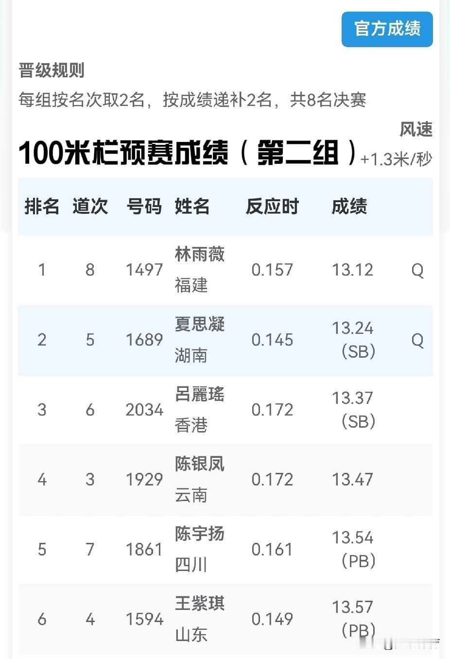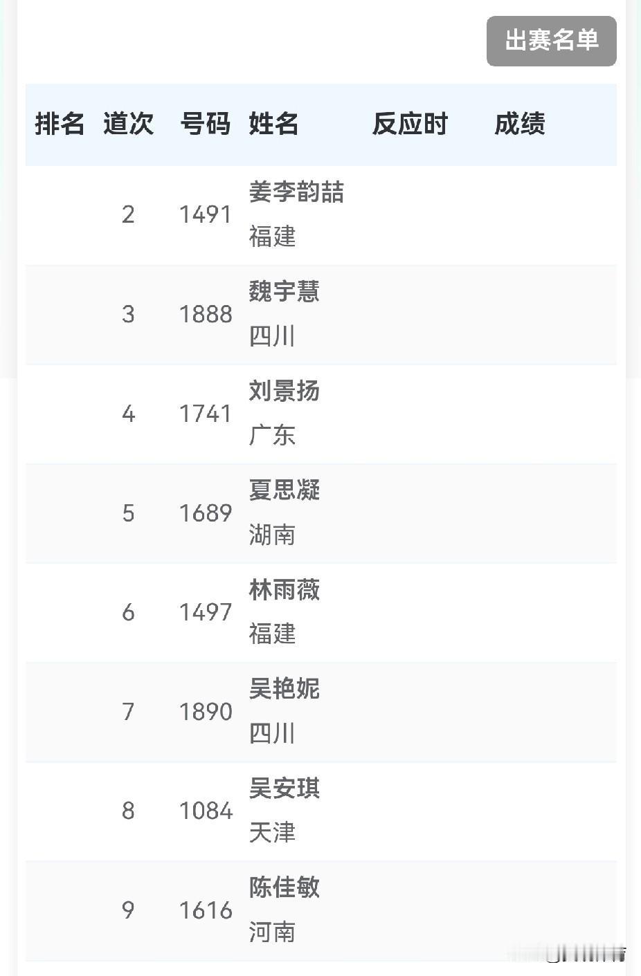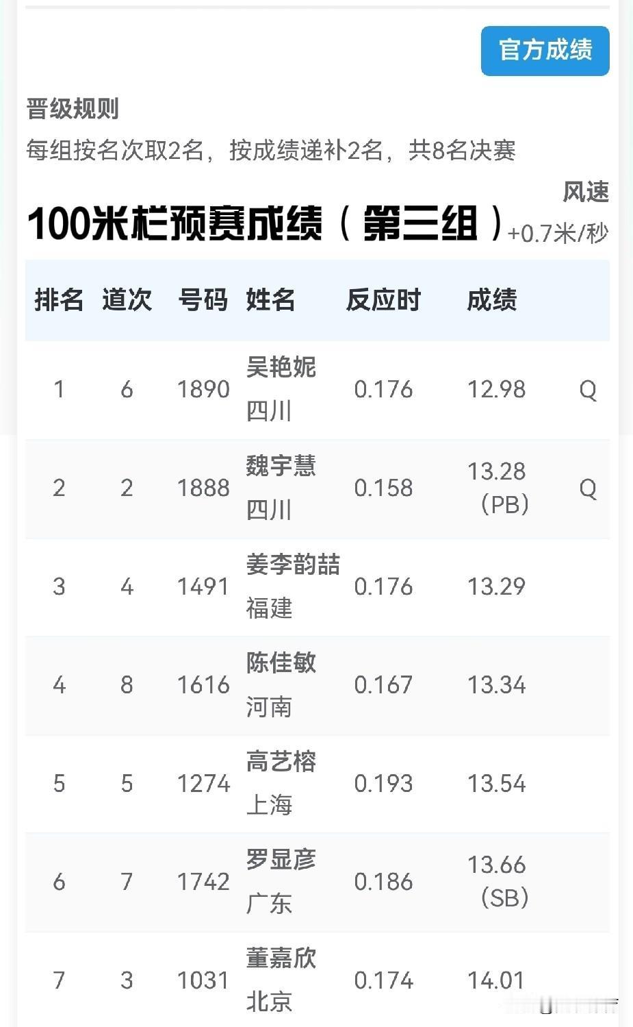 全运会女子100米栏预赛吴艳妮跑出12.98秒:决赛请关注五、六、七道“美丽风景线” 全运会女子100米栏预赛吴艳妮跑出12.98秒,预赛排名第一。林雨薇13.12秒第二。决赛道次五、六、七道分别是夏思凝、林雨薇、吴艳妮。 道次 /号码/ 姓名 2 /1491 /姜李韵喆 福建 3 /1888 /魏宇慧 四川 4 /1741 /刘景扬 广东 5 /1689 /夏思凝 湖南 6 /1497 /林雨薇 福建 7 /1890 /吴艳妮 四川 8 /1084 /吴安琪 天津 9 /1616 /陈佳敏 河南