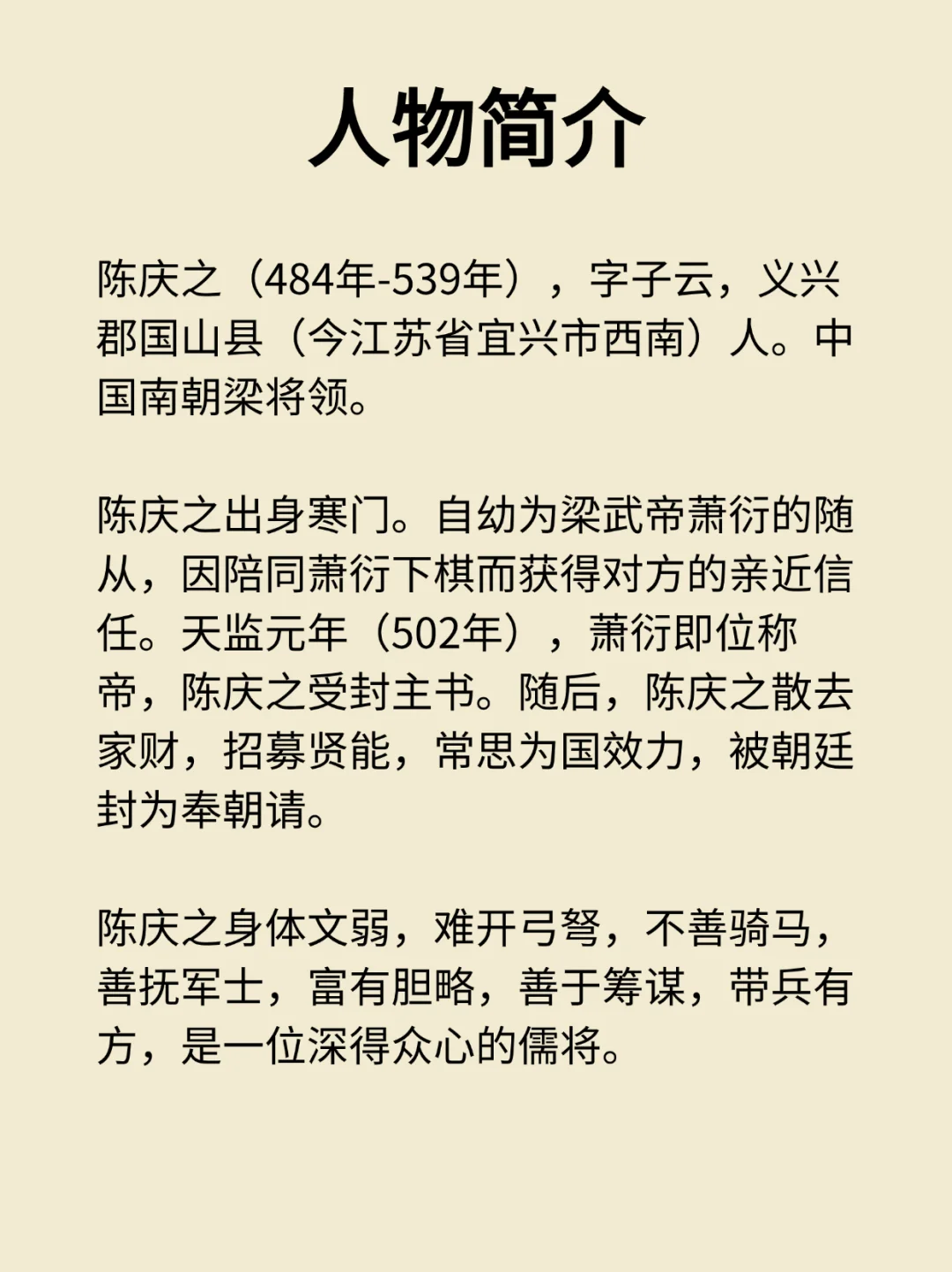 [气球R]陈庆之身体文弱,难开弓弩,不善骑马,善抚军士,富有胆略,善于筹谋,带兵有方,是一位深得众心的儒将。