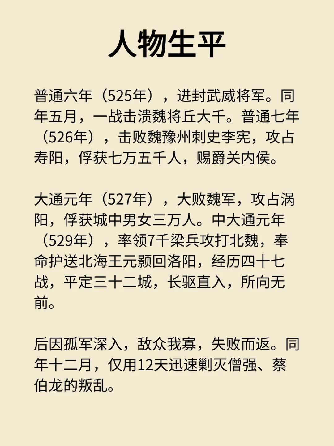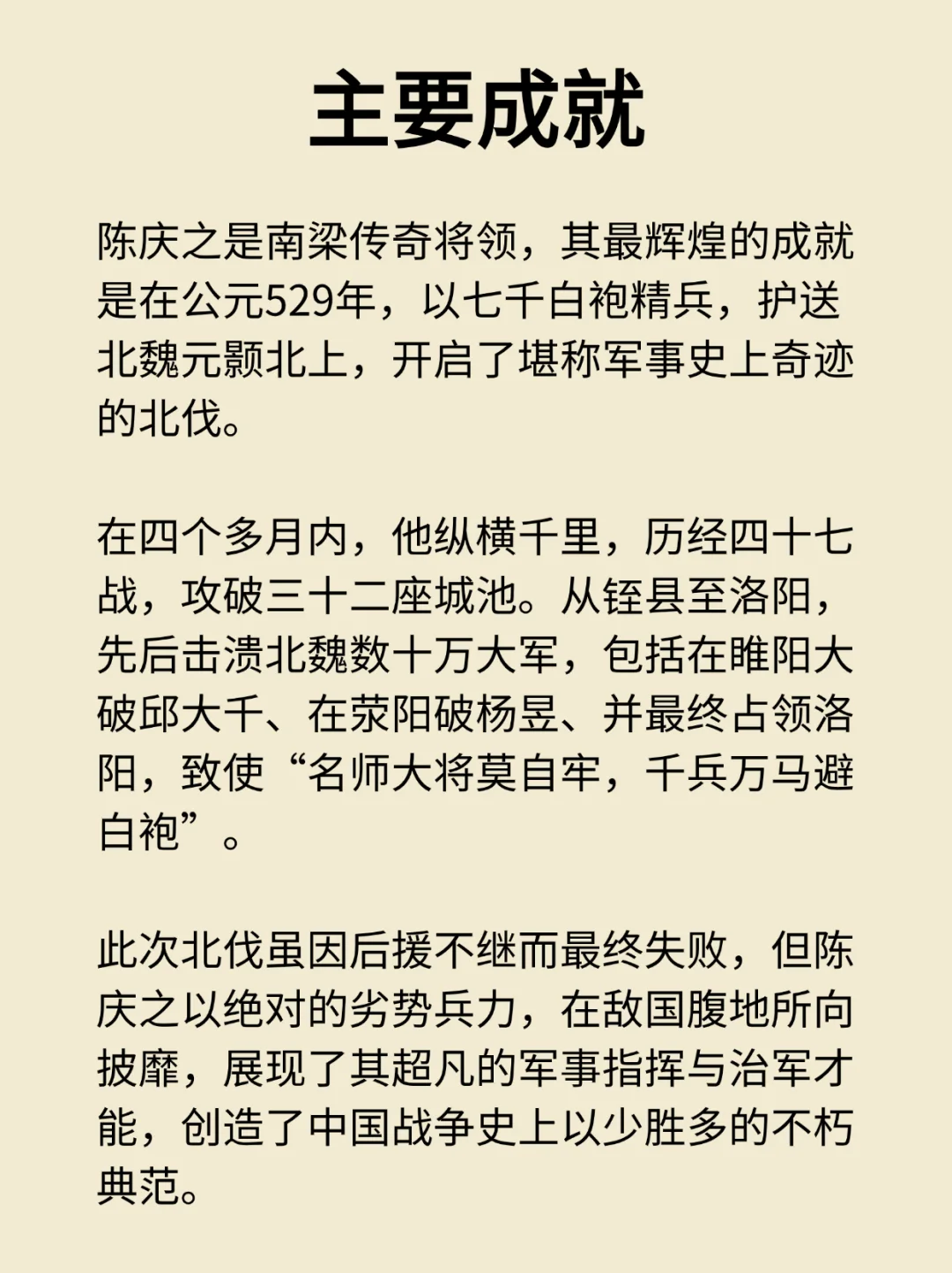 [拔草R]此次北伐虽因后援不继而最终失败,但陈庆之以绝对的劣势兵力,在敌国腹地所向披靡,展现了其超凡的军事指挥与治军才能,创造了中国战争史上以少胜多的不朽典范。