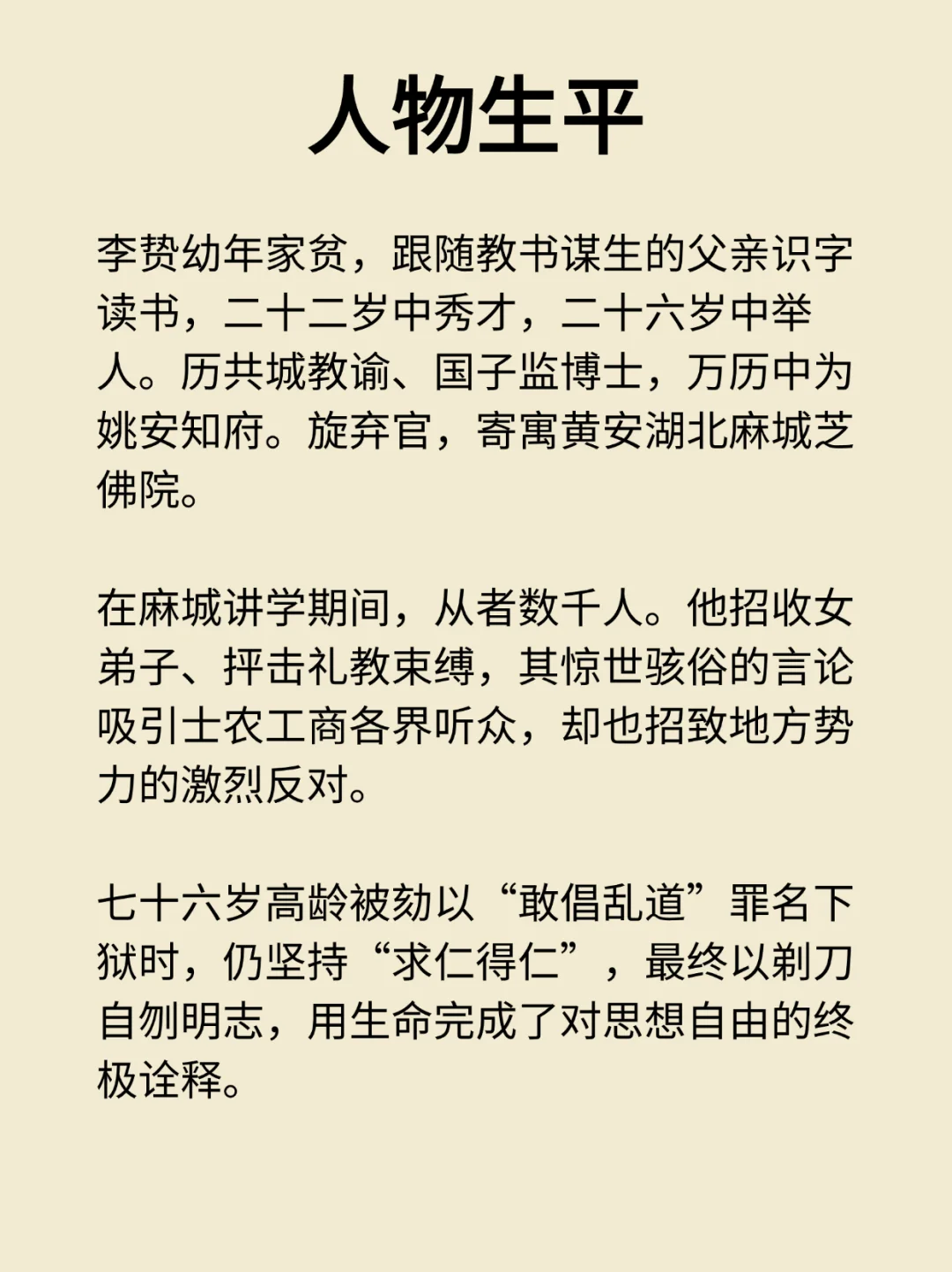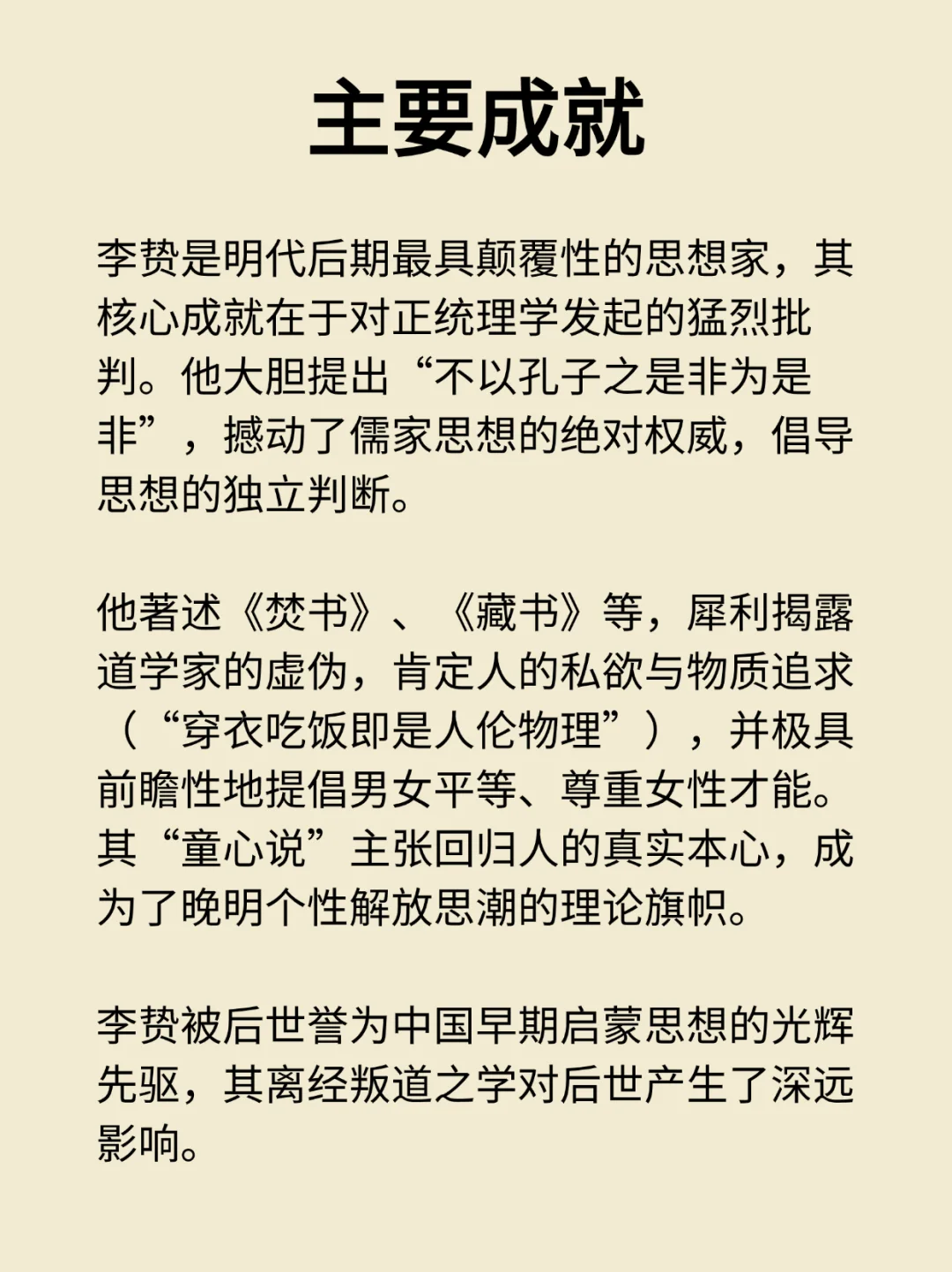 [星R]他著述《焚书》、《藏书》等,犀利揭露道学家的虚伪,肯定人的私欲与物质追求(“穿衣吃饭即是人伦物理”),并极具前瞻性地提倡男女平等、尊重女性才能。其“童心说”主张回归人的真实本心,成为了晚明个性解放思潮的理论旗帜。