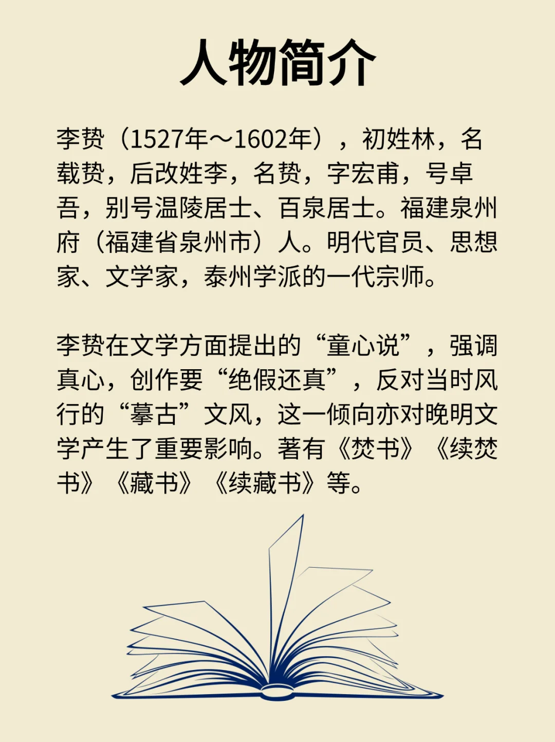 [种草R]李贽在文学方面提出的“童心说”,强调真心,创作要“绝假还真”,反对当时风行的“摹古”文风,这一倾向亦对晚明文学产生了重要影响。著有《焚书》《续焚书》《藏书》《续藏书》等。