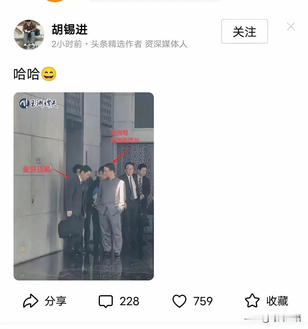 谈的不满意,现场很严肃,老胡为什么要哈哈?是嘲笑金井正彰吗? 千万不要以为日本人低下头就等于认错了,这不过是它们欺骗别人虚假的表象。 上一秒点头鞠躬,下一秒也会拔刀反杀,历史上没少出现这样的场景,比如偷袭珍珠港。 对日本要有足够的警惕,反正这事很严肃,笑是笑不出来的,包括嘲笑。