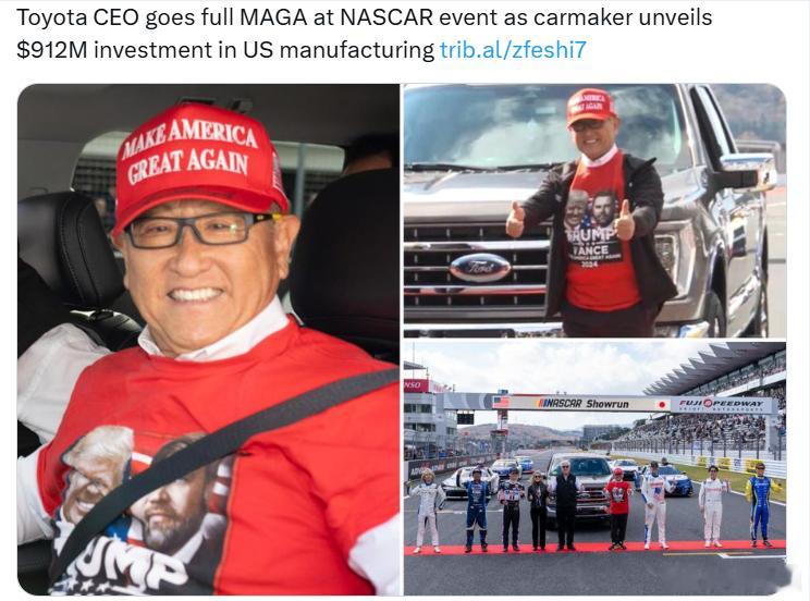 丰田首席执行官在NASCAR赛事上全面“拥抱 MAGA”,同时这家汽车制造商宣布将在美国制造业投入9.12亿美元。