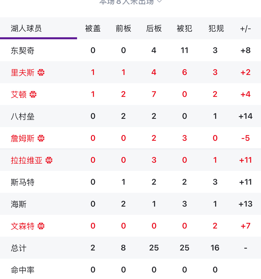 湖人把爵士打崩盘了领先13分了 看了一眼数据 詹姆斯2双数据 11分10助攻 但是为什么他的正负值这会是-5 ?