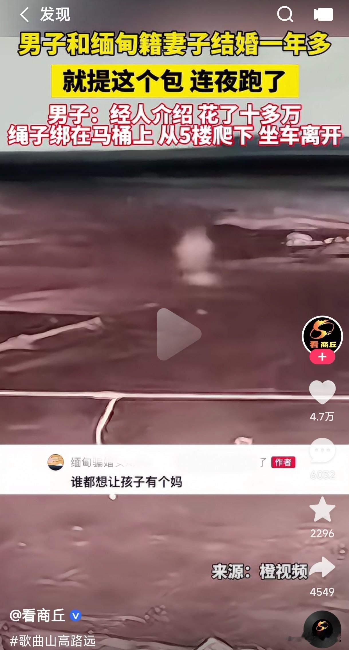 男子经人介绍花10多万和缅甸籍妻子结婚一年多,她半夜把绳子绑在马桶上从5楼爬下,提个包连夜坐车跑了。 说实话就是本地知根知己的说不过就不过,提包跑路的也有很多,这种外籍的就更不用说了,不知这是真心实意过日子,中途出现什么情况跑路的,还是这纯粹是故意骗婚的?这外籍女子的攀爬技术这么厉害吗?居然把绳子绑在马桶上从5楼爬下去跑了,这是提前就练习过的还是人家天生爬楼的技术就高人一等? 不得不说这为了逃跑也是费尽心思,就不怕把马桶拉坏掉下去摔死吗?所有的悲伤注定让孩子承受了,这种下蛋不管蛋的女人到底值的娶吗?