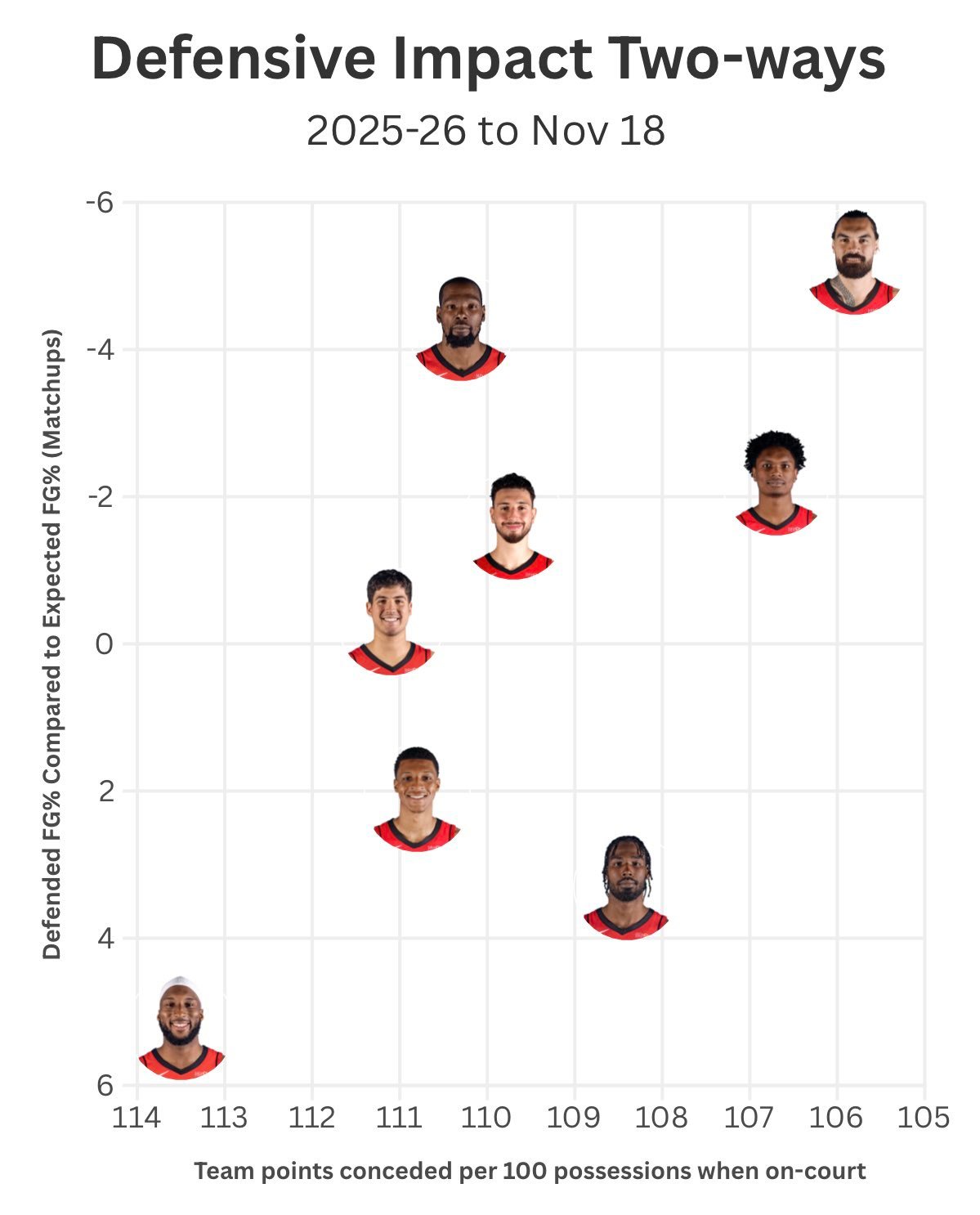 火箭队八名轮换球员分布图📊⬆️纵轴-防守实际命中率与预期差值:个体防