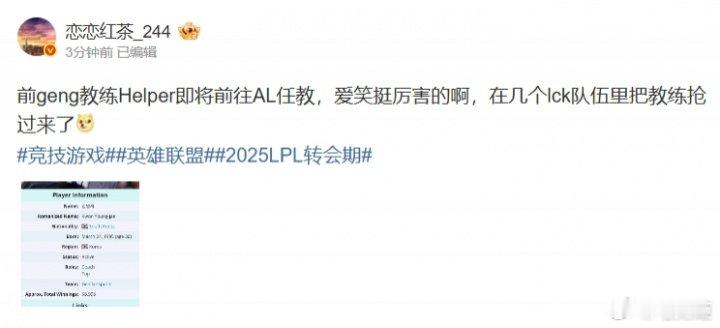 前职业教练涵艺爆料称:AL的教练定了,是LCK冠军+MSI+EWC冠军主教练!随后爆料人“恋恋红茶”也更博:前geng教练Helper即将前往AL任教,爱笑挺厉害的啊,在几个lck队伍里把教练抢过来了。Helper执教过LPL赛区的队伍,曾在2020年担任SN的教练,后续在PSG、HLE和GEN执教过!