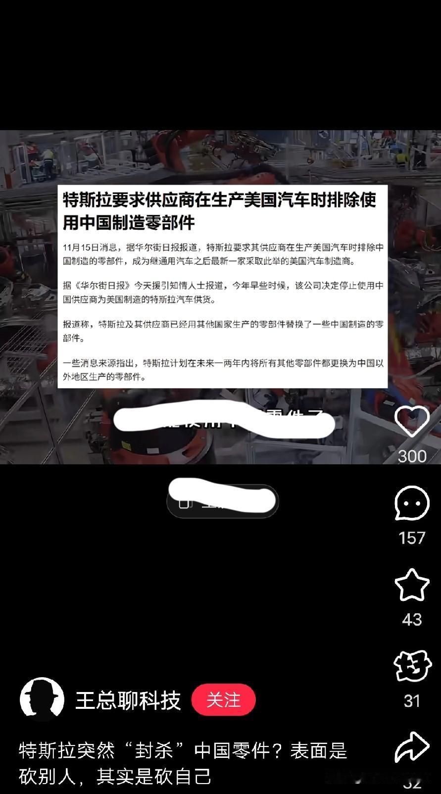 特朗普施压下特斯拉“去中国零件”:成本与市场的双重赌注[玫瑰][玫瑰][玫瑰] 11月15日消息,特斯拉要求供应商为美国icon产车型排除中国零部件,成为继通用后又一家跟进的美企。目前其已替换部分中国零件,并计划1-2年内完成全部替代。 中国零部件以高性价比支撑着特斯拉的成本优势,此番调整或推高美国车型售价。对中国供应商而言,短期订单承压,但也将加速其拓展全球其他市场的步伐。这场供应链“转向”,是特斯拉在政策与市场间的平衡,最终效果仍待成本与销量的双重检验。