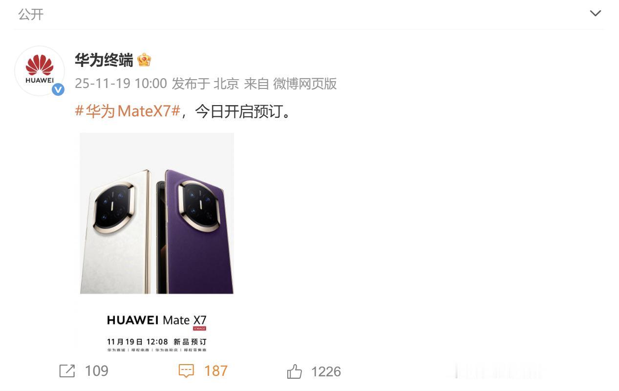 来了来了!华为Mate X7终于官宣可以预订了!就在今天,华为终端在官方平台上直接放出了预订海报,一下子就在科技圈里传开了。 同一天,华为还发了一个挺有意思的视频。视频里专门挑了那些我们平时觉得最难拍的场景,比如水族馆里容易把脸拍得蓝哇哇的灯光、晚上生日会上只有一点蜡烛光的角落,还有舞台上灯光特亮、台下特暗的反差环境。结果华为Mate X7拍出来的效果,颜色都挺正,不跑偏。看样子这次在拍照上,尤其是对付复杂光线,应该是下了不少功夫。 还有一个值得关注的亮点!此次预订时,华为将正式公布华为Mate X7的全部五款配色:云锦白、云锦蓝、幻影紫、曜石黑、寰宇红。又是提升拍照,又是带来多彩配色,华为Mate X7这次看来是憋了个大招。 现在手机已经可以预订了,感兴趣的朋友可以去官方渠道了解一下。 华为MateX7开启预订